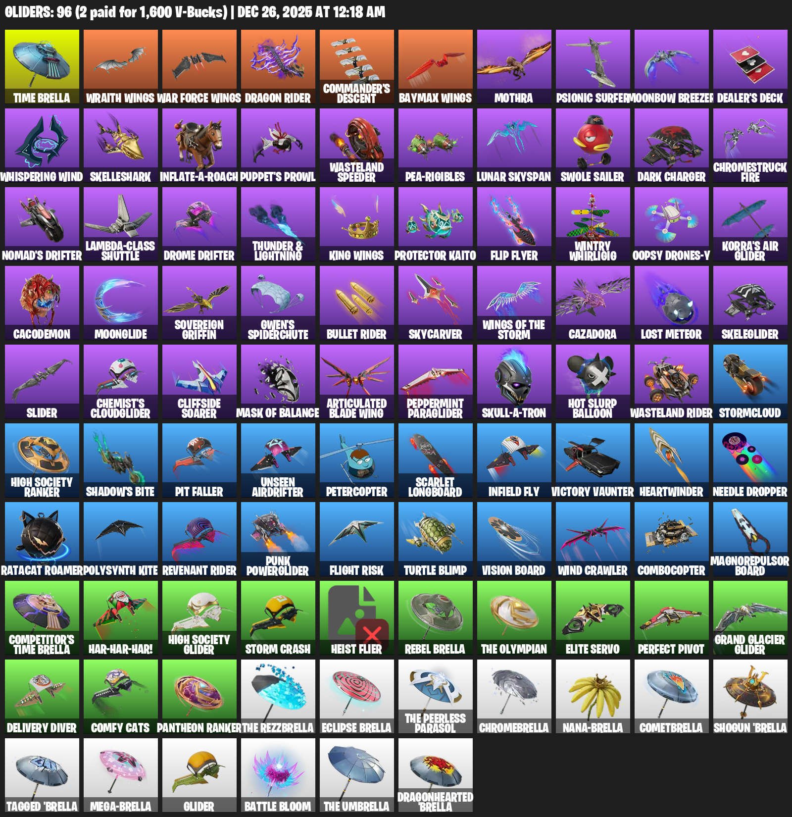 Time Brella, Wraith Wings, Commander’s Descent, Mothra, Psionic Surfer, Moonbow Breezer, Dealer’s Deck, Whispering Wind, Skelleshark, Puppet’s Prowl, Wasteland Speeder, Pea-rigibles, Swole Sailer, Dark Charger, Chromestruck Fire