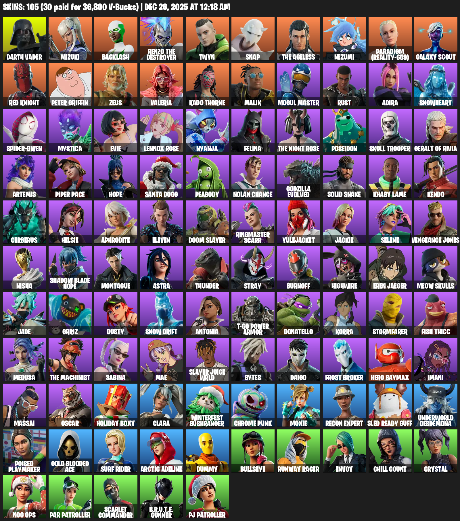 Darth Vader, Mizuki, Backlash, Renzo the Destroyer, Twyn, Snap, Nezumi, Paradigm (Reality-659), Galaxy Scout, Red Knight, Peter Griffin, Zeus, Valeria, Kado Thorne, Malik, Mogul Master, Rust, Adira, Snowheart