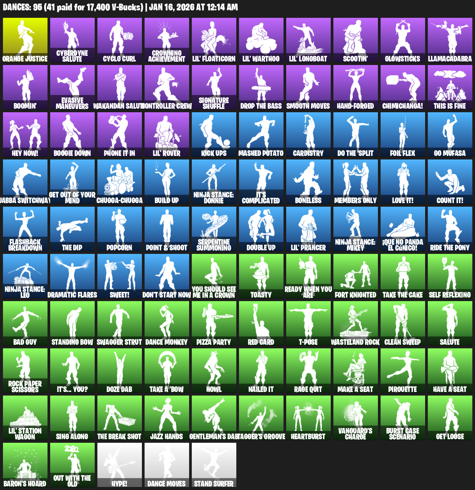 Cyberdyne Salute, Cyclo Curl, Crowning Achievement, Lil’ Floaticorn, Scootin’, Glowsticks, Llamacadabra, Boomin’, Evasive Maneuvers, Controller Crew, Signature Shuffle, Smooth Moves, Hand-Forged, Chimichanga!, This is Fine