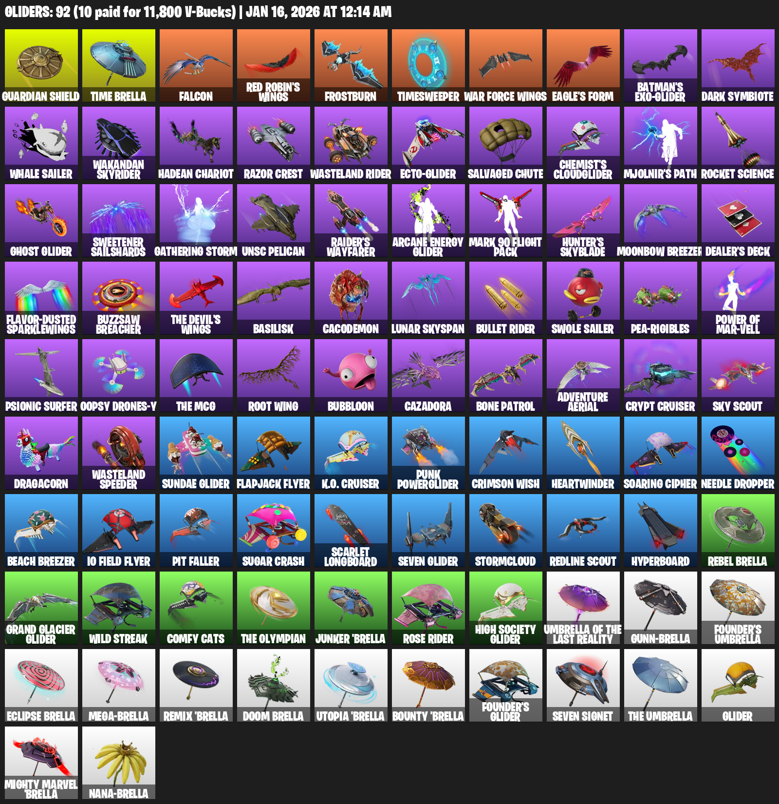 Guardian Shield, Time Brella, Falcon, Red Robin’s Wings, Frostburn, Timesweeper, Eagle’s Form, Batman’s Exo-Glider, Dark Symbiote, Whale Sailer, Wakandan Skyrider, Razor Crest, Wasteland Rider, Salvaged Chute, Chemist’s Cloudglider, Mjolnir’s Path, Rocket Science