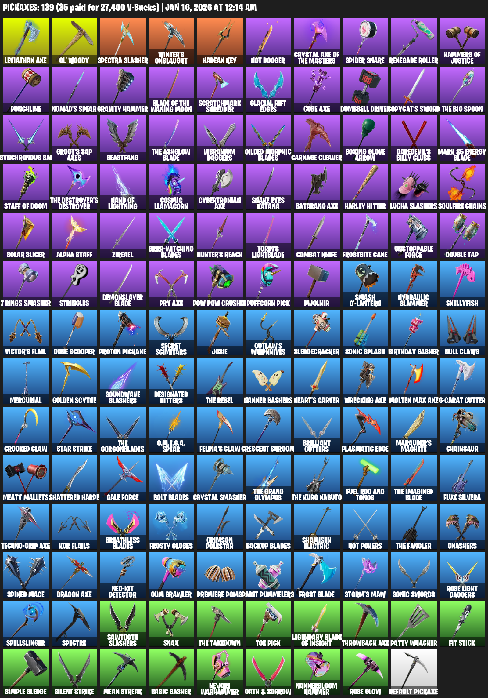 Leviathan Axe, Ol’ Woody, Winter’s Onslaught, Hadean Key, HOT DOGGER, Spider Snare, Renegade Roller, Hammers of Justice, Punchline, Nomad’s Spear, Gravity Hammer, Scratchmark Shredder, Glacial Rift Edges, Dumbbell Driver, Copycat’s Sword