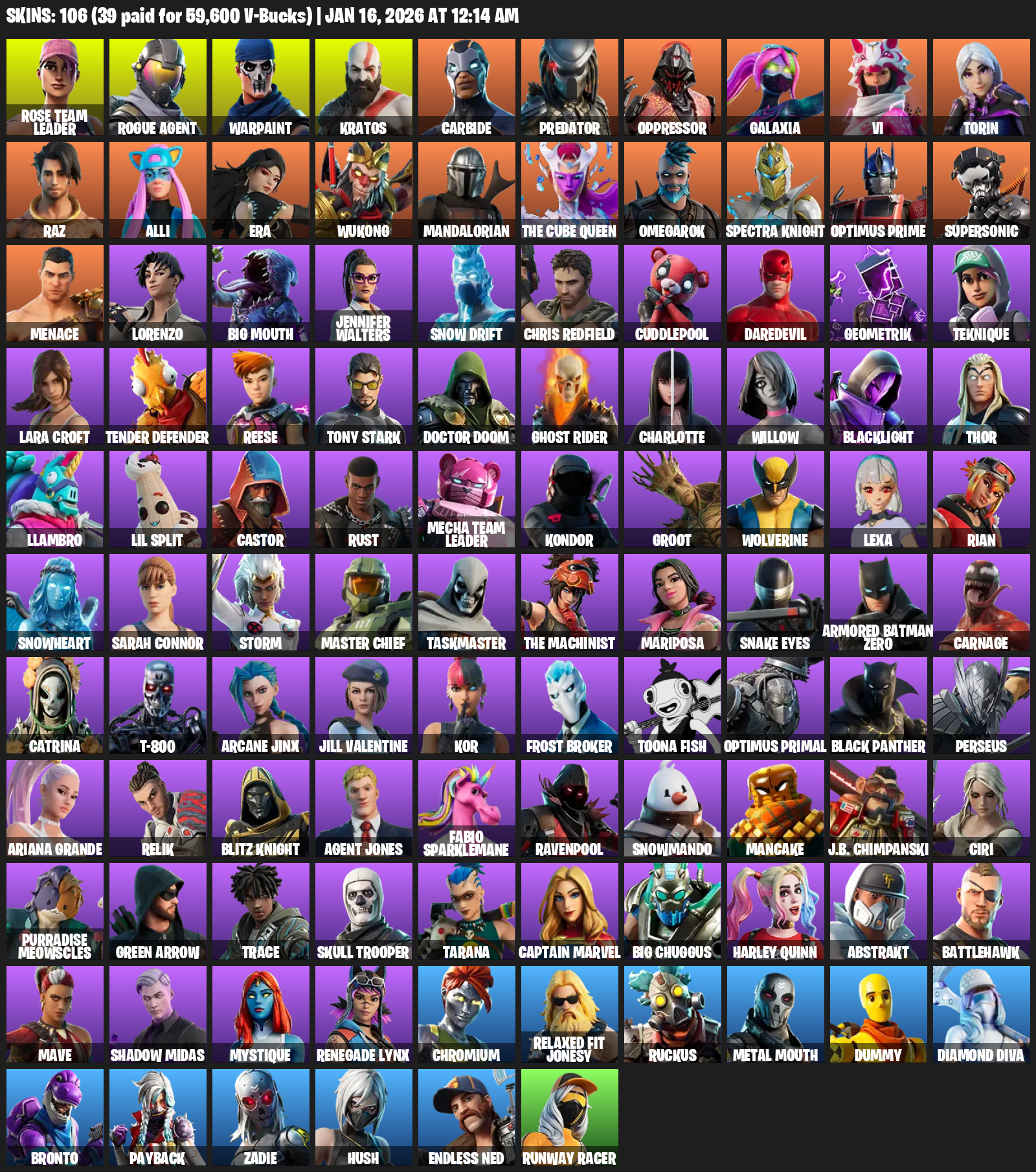 Lara Croft, Rose Team Leader, Rogue Agent, Warpaint, Kratos, Carbide, Predator, Oppressor, Galaxia, Vi, Torin, Raz, Alli, Era, Wukong, Mandalorian, The Cube Queen, Omegarok, Spectra Knight, Optimus Prime