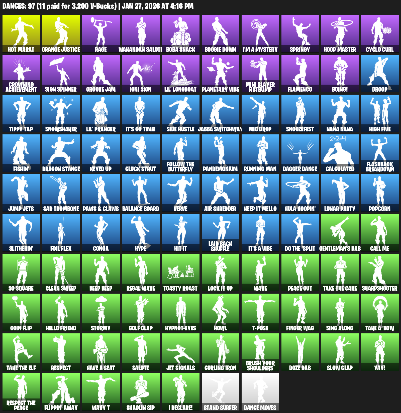Hot Marat, Rage, Wakandan Salute, Boba Snack, Boogie Down, I’m a Mystery, Springy, Hoop Master, Cyclo Curl, Crowning Achievement, Sign Spinner, Groove Jam, Lil’ Longboat, Planetary Vibe, Mini Slayer Fistbump, Flamenco, Boing!, Droop