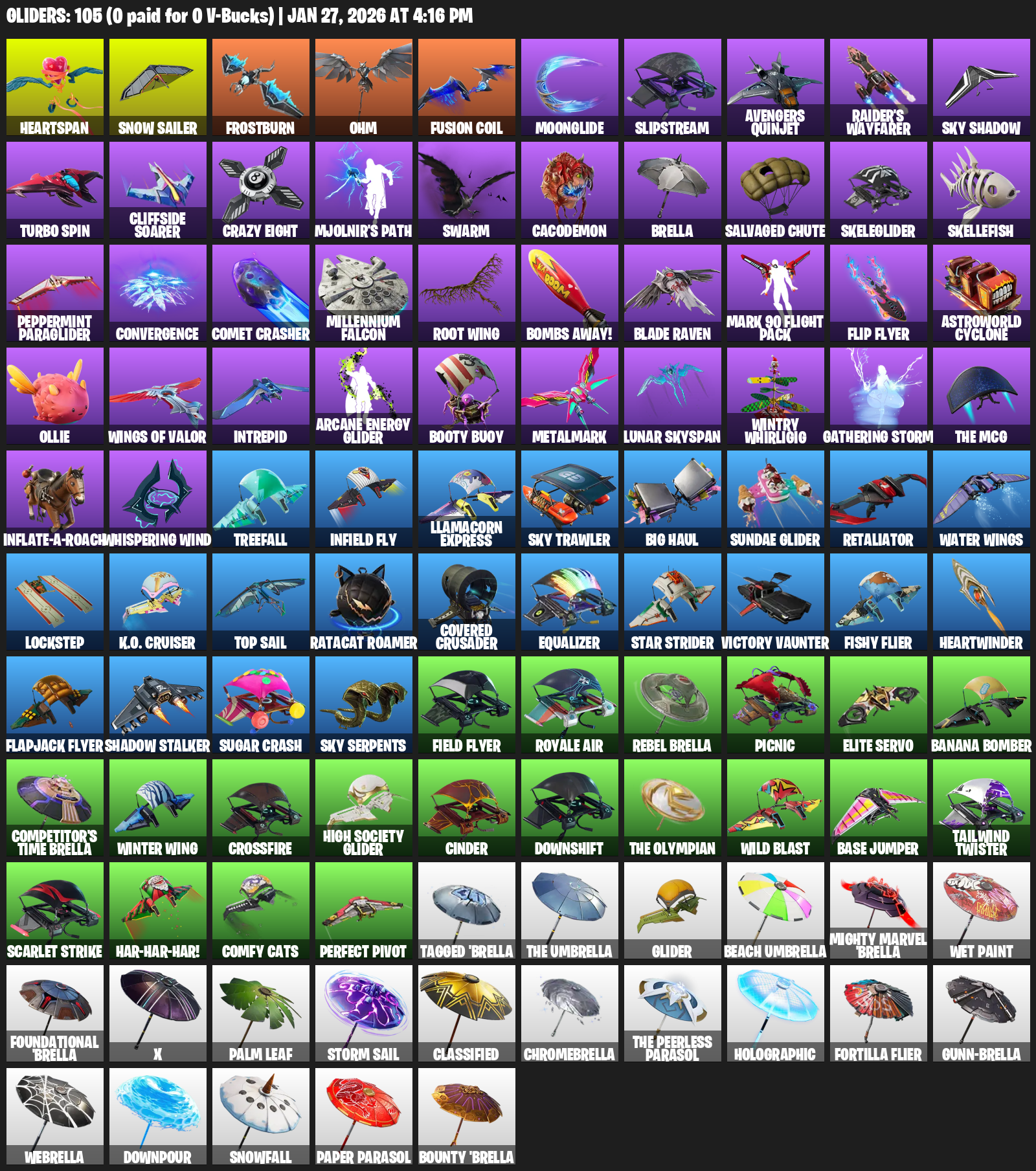 Heartspan, Snow Sailer, Frostburn, Ohm, Moonglide, Slipstream, Avengers Quinjet, Raider’s Wayfarer, Turbo Spin, Cliffside Soarer, Crazy Eight, Mjolnir’s Path, Swarm, Cacodemon, Brella, Salvaged Chute, Skeleglider, Skellefish