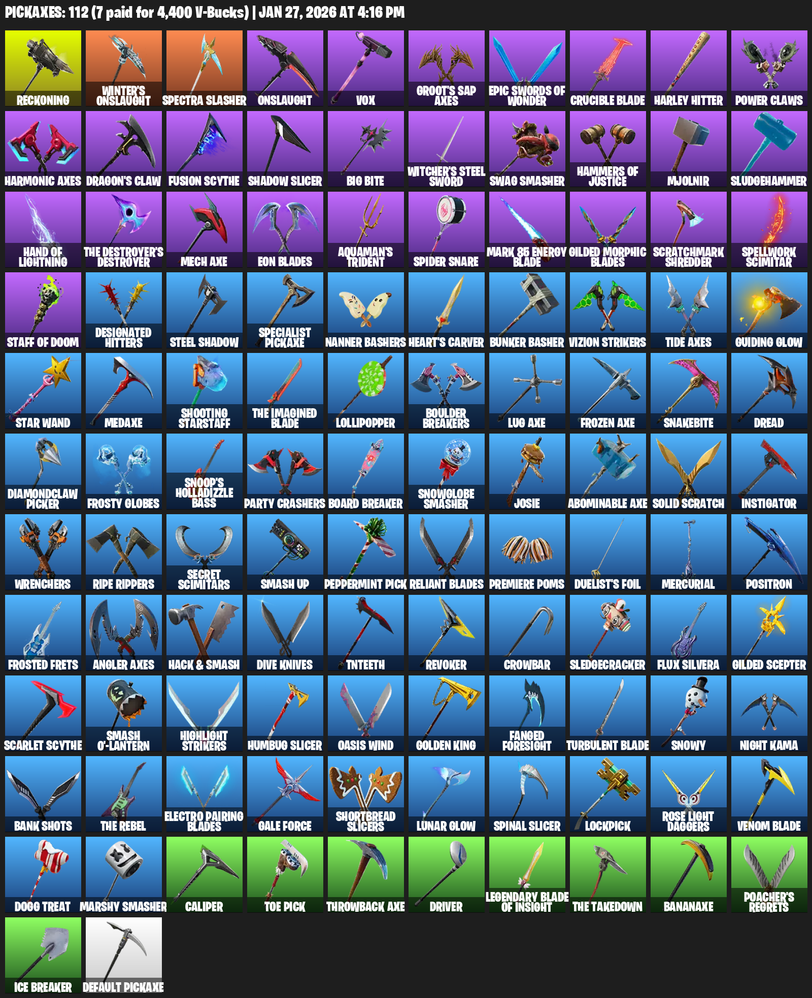 Reckoning, Winter’s Onslaught, Vox, Groot’s Sap Axes, Crucible Blade, Harley Hitter, Power Claws, Dragon’s Claw, Shadow Slicer, Big Bite, Witcher’s Steel Sword, Swag Smasher, Hammers of Justice, Mjolnir, Sludgehammer