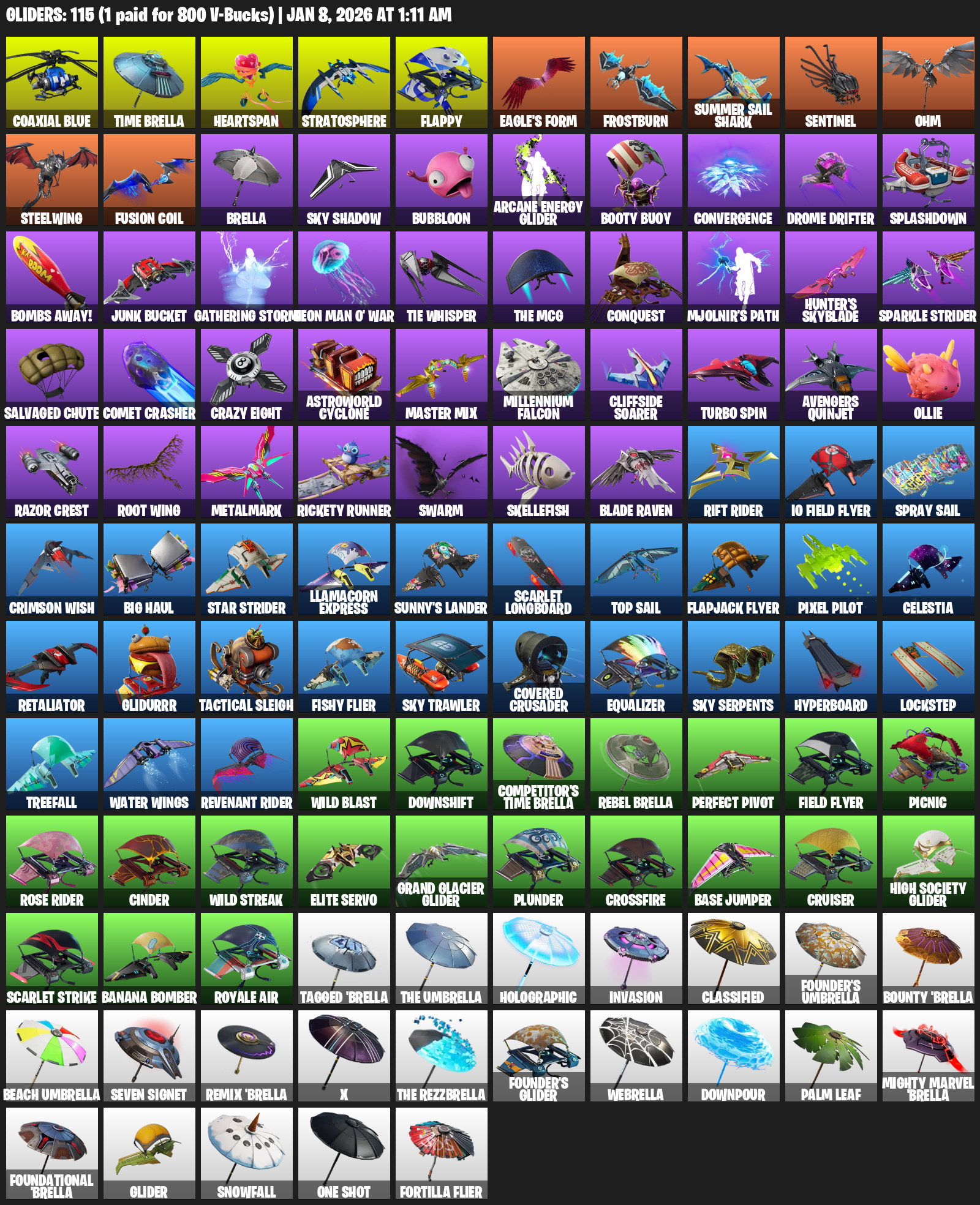 Coaxial Blue, Time Brella, Heartspan, Stratosphere, Flappy, Eagle’s Form, Frostburn, Summer Sail Shark, Sentinel, Ohm, Steelwing, Bubbloon, Arcane Energy Glider, Booty Buoy, Convergence, Drome Drifter, Splashdown