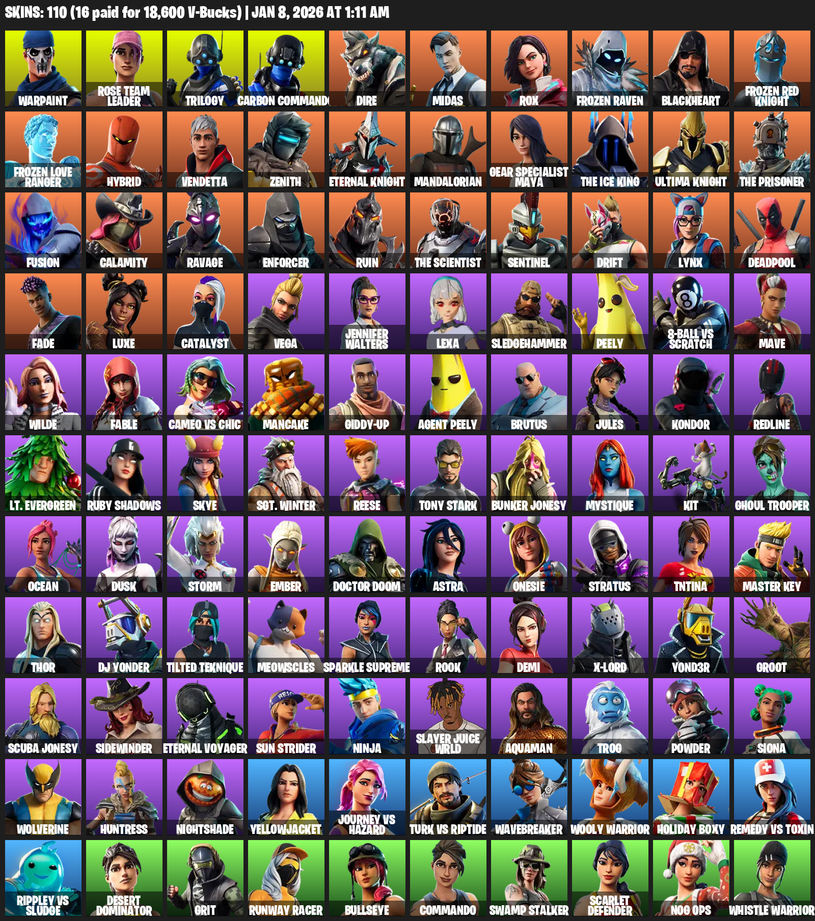 Gear Specialist Maya, Warpaint, Rose Team Leader, Trilogy, Carbon Commando, Dire, Midas, Rox, Frozen Raven, Blackheart, Hybrid, Vendetta, Zenith, Eternal Knight, Mandalorian, The Ice King
