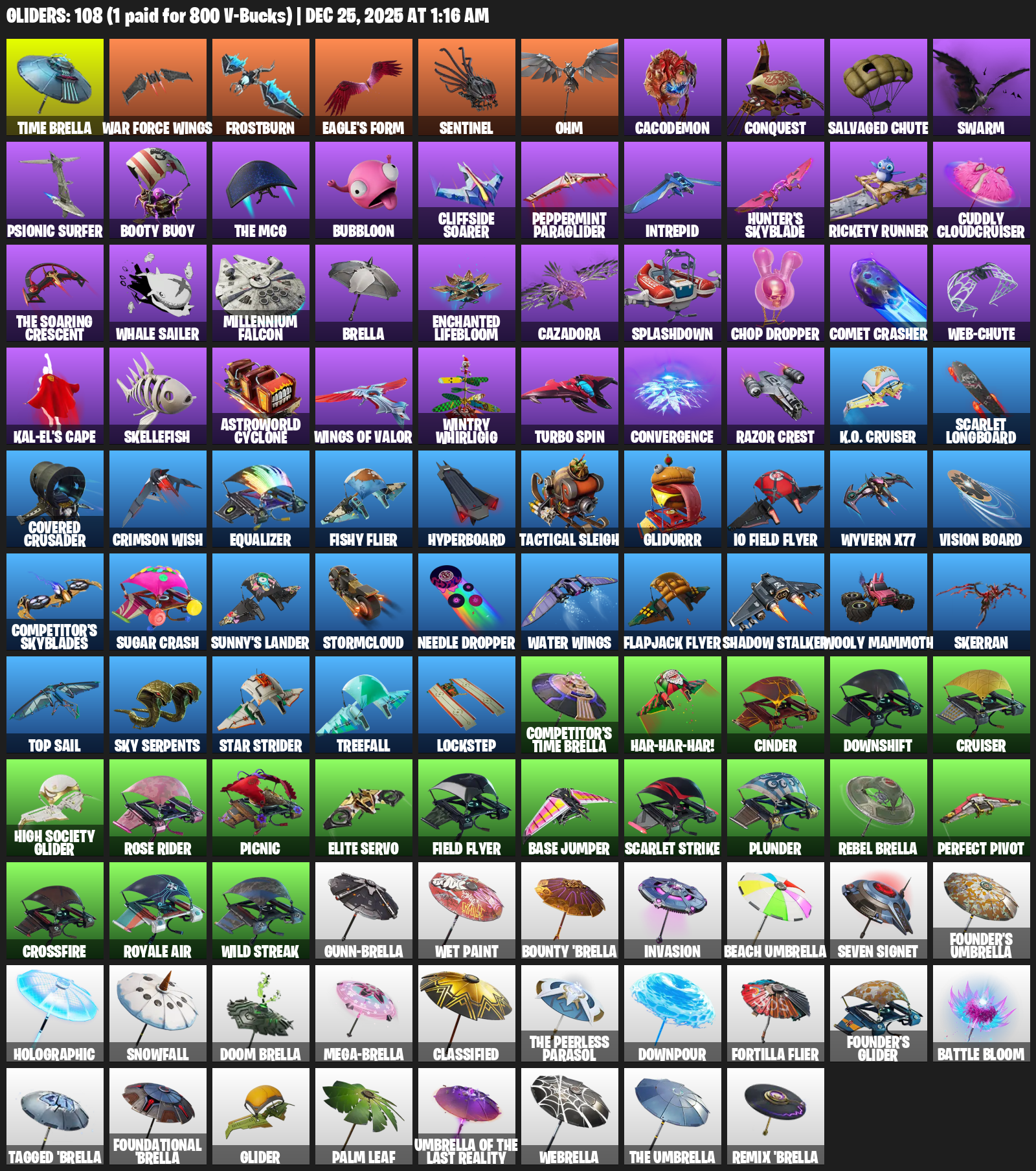Time Brella, War Force Wings, Frostburn, Eagle’s Form, Ohm, Cacodemon, Conquest, Salvaged Chute, Swarm, Psionic Surfer, Booty Buoy, Bubbloon, Cliffside Soarer, Peppermint Paraglider, Intrepid, Hunter’s Skyblade, Rickety Runner, Cuddly Cloudcruiser