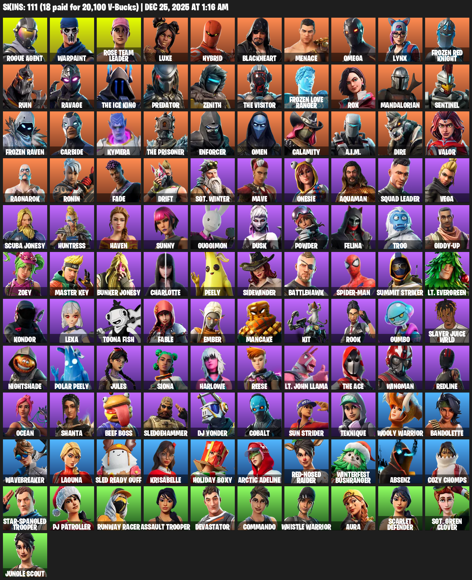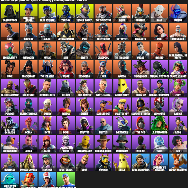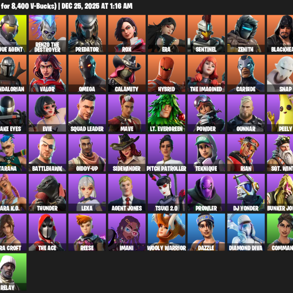 Omega, Rogue Agent, Warpaint, Rose Team Leader, Luxe, Hybrid, Blackheart, Menace, Lynx, Frozen Red Knight, Ruin, Ravage, The Ice King, Predator, Zenith, Rox, Mandalorian, Sentinel