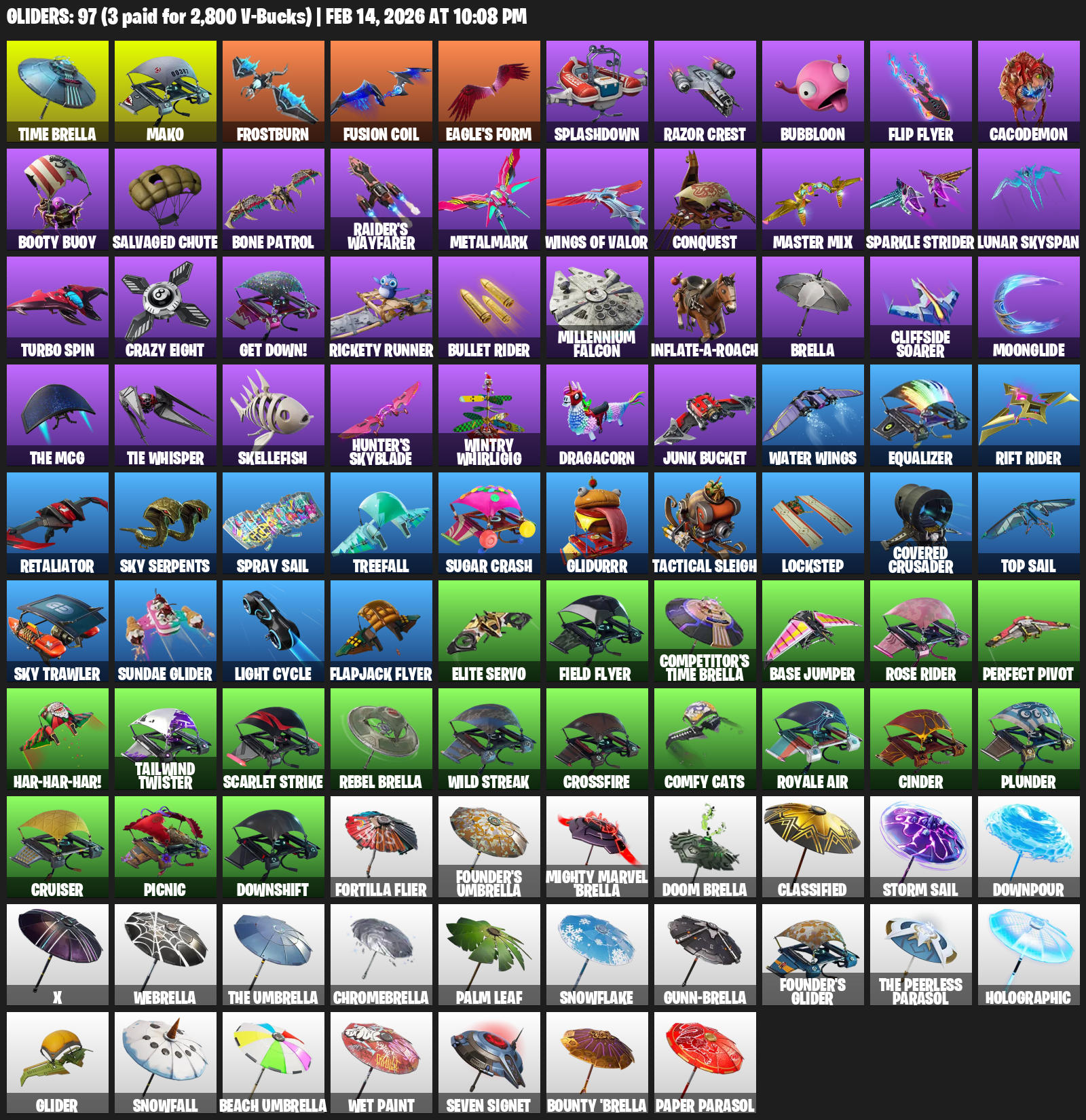 Mako, Time Brella, Frostburn, Eagle’s Form, Splashdown, Razor Crest, Bubbloon, Flip Flyer, Cacodemon, Booty Buoy, Salvaged Chute, Bone Patrol, Raider’s Wayfarer, Metalmark, Wings of Valor, Conquest, Sparkle Strider, Lunar Skyspan