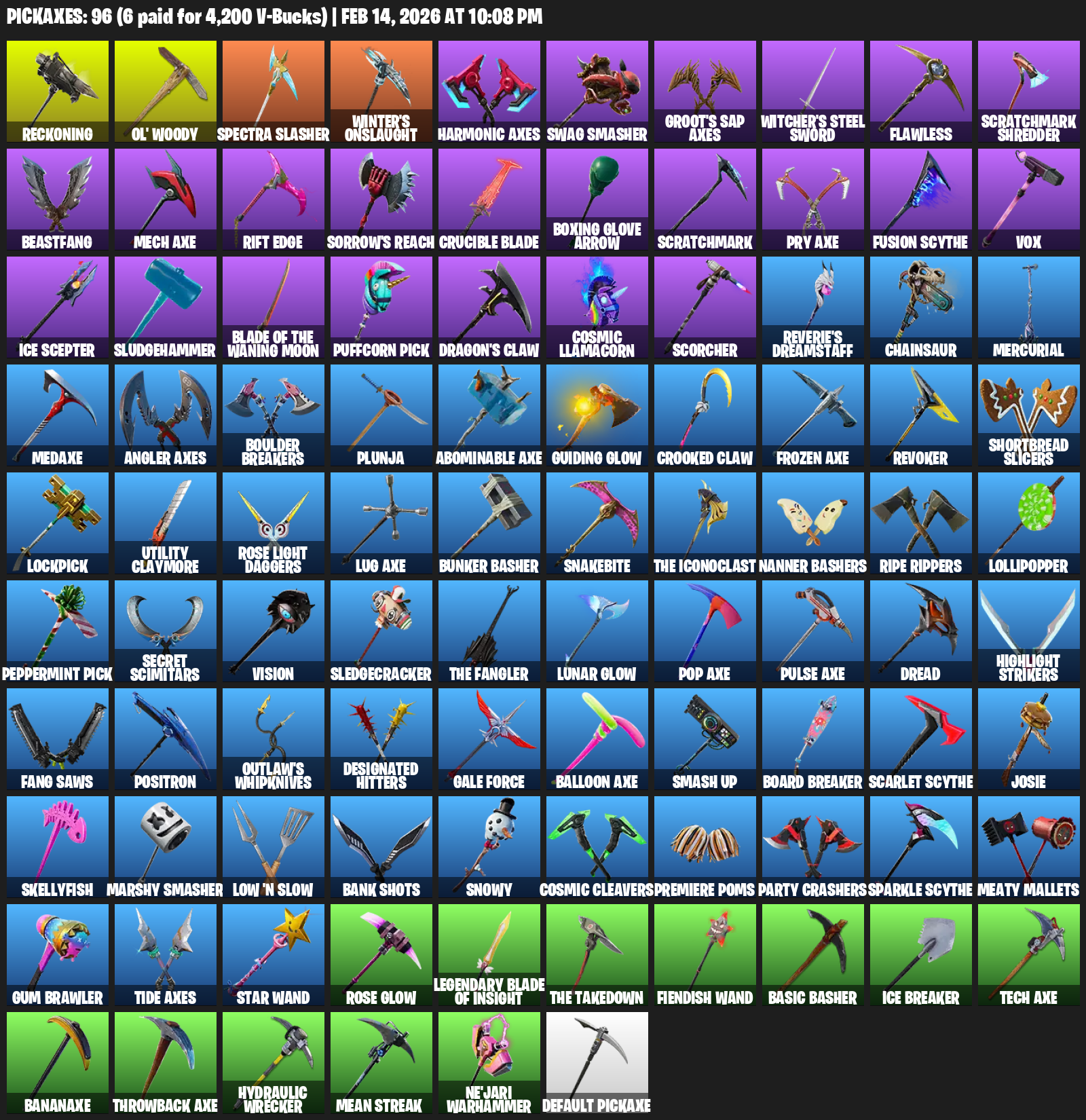 Reckoning, Ol’ Woody, Spectra Slasher, Winter’s Onslaught, Harmonic Axes, Swag Smasher, Witcher’s Steel Sword, Flawless, Scratchmark Shredder, Beastfang, Mech Axe, Rift Edge, Sorrow’s Reach, Crucible Blade, Boxing Glove Arrow, Vox