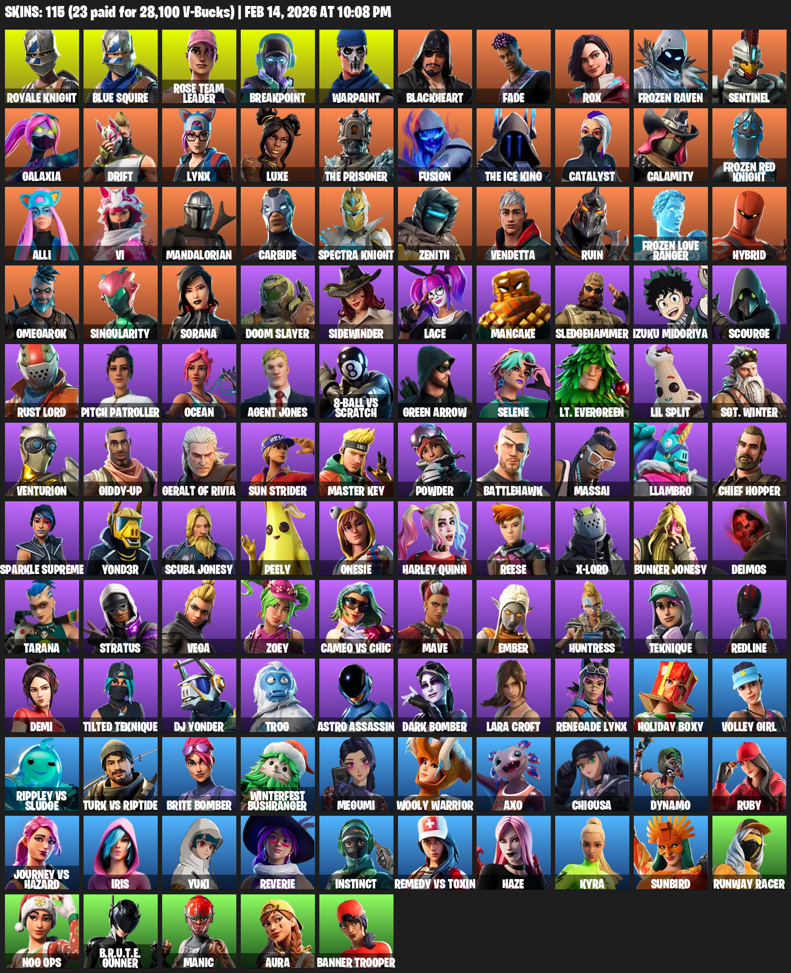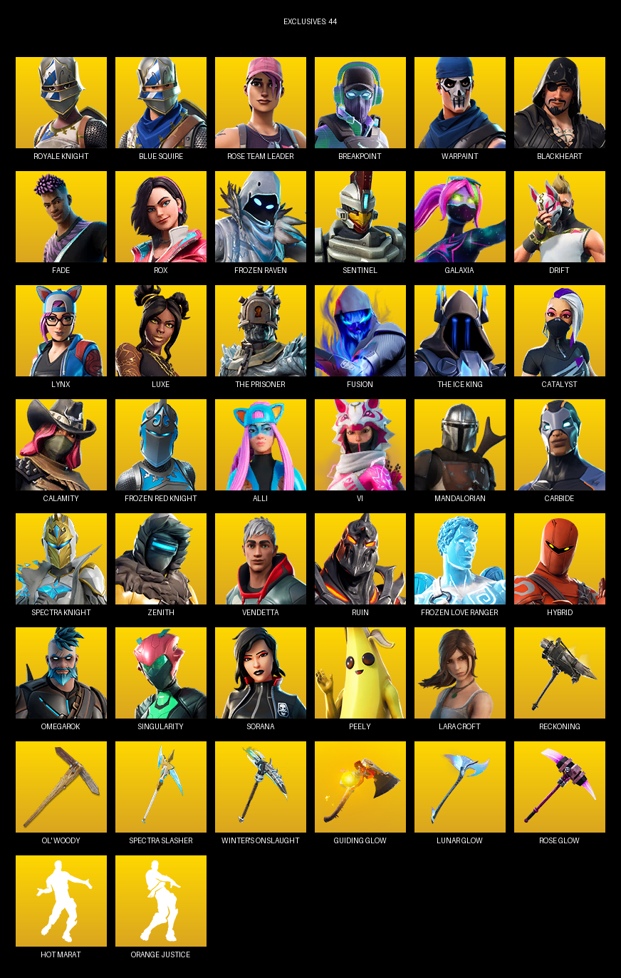 Royale Knight, Blue Squire, Lara Croft, Rose Team Leader, Breakpoint, Warpaint, Blackheart, Fade, Rox, Frozen Raven, Sentinel, Galaxia, Drift, Lynx, Luxe, The Prisoner, Fusion, Catalyst, Calamity