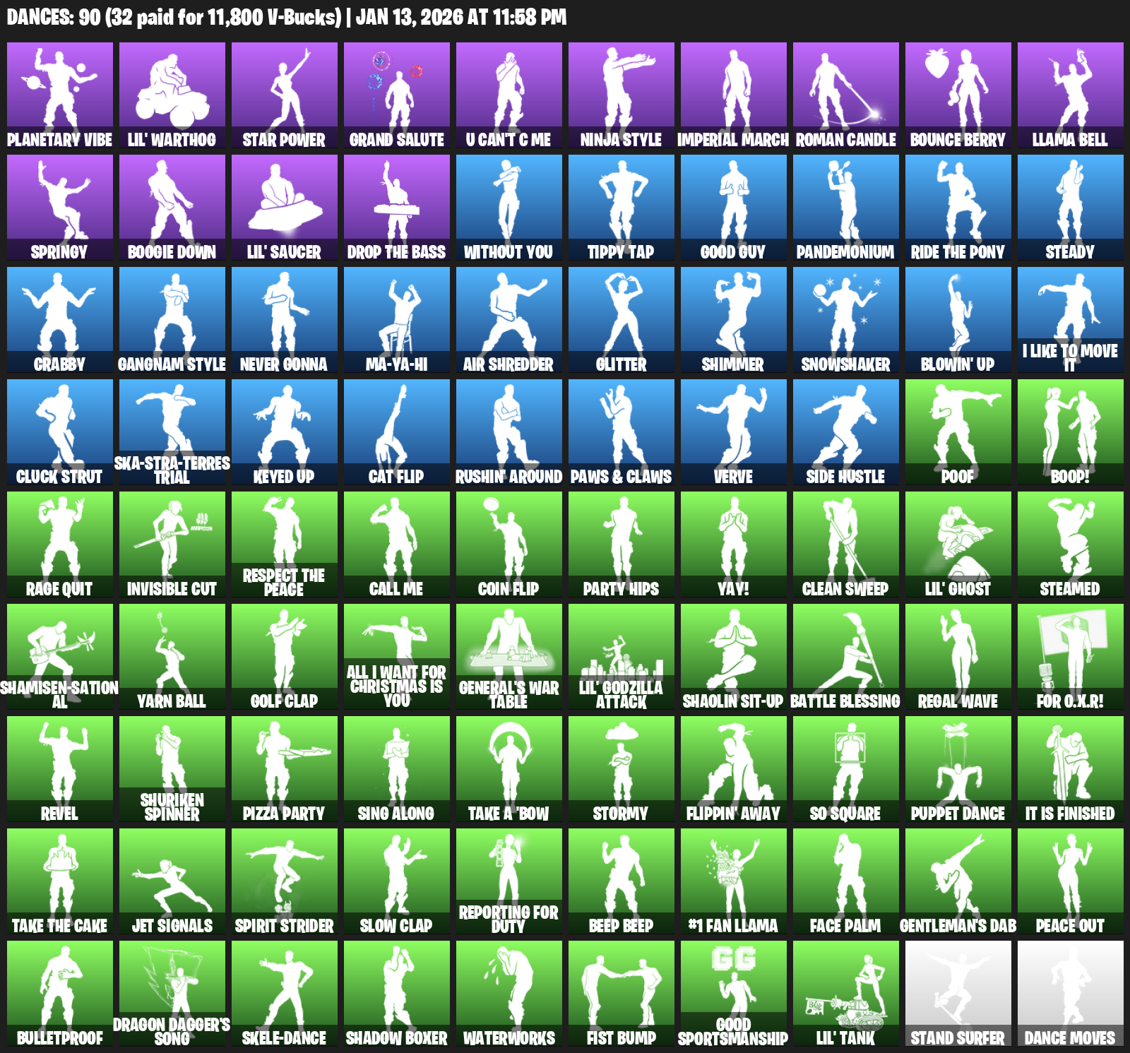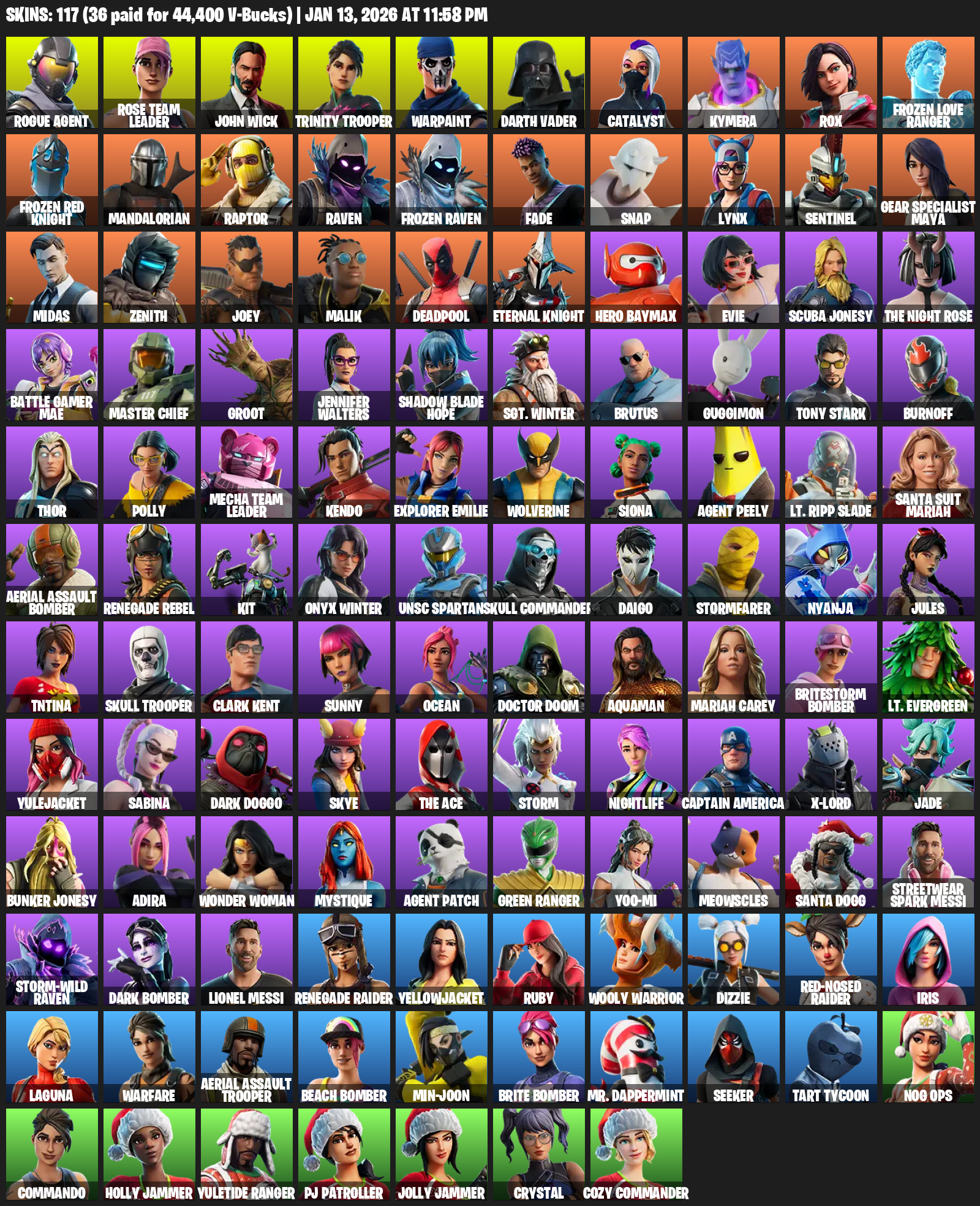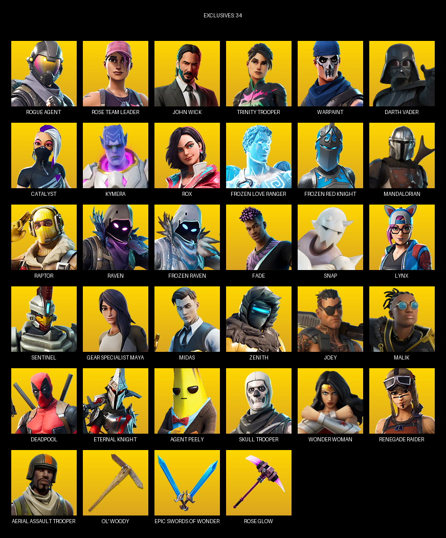 Gear Specialist Maya, Renegade Raider, Aerial Assault Trooper, Rogue Agent, Rose Team Leader, John Wick, Warpaint, Darth Vader, Catalyst, Kymera, Rox, Frozen Love Ranger, Mandalorian, Raptor, Raven, Fade, Snap