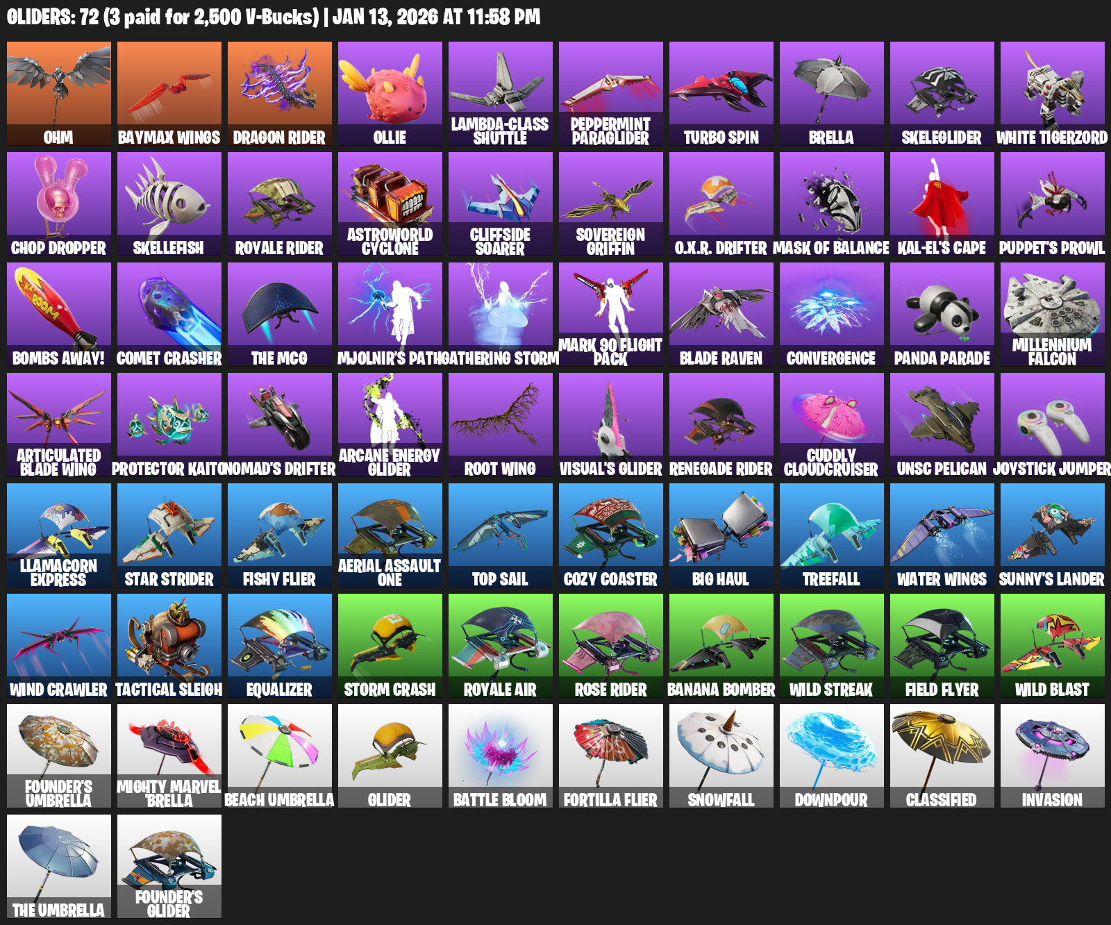 Ohm, Baymax Wings, Ollie, Lambda-Class Shuttle, Peppermint Paraglider, Turbo Spin, Brella, Skeleglider, White Tigerzord, Chop Dropper, Skellefish, Royale Rider, Astroworld Cyclone, Cliffside Soarer, Sovereign Griffin, O.X.R. Drifter, Kal-El’s Cape, Puppet’s Prowl