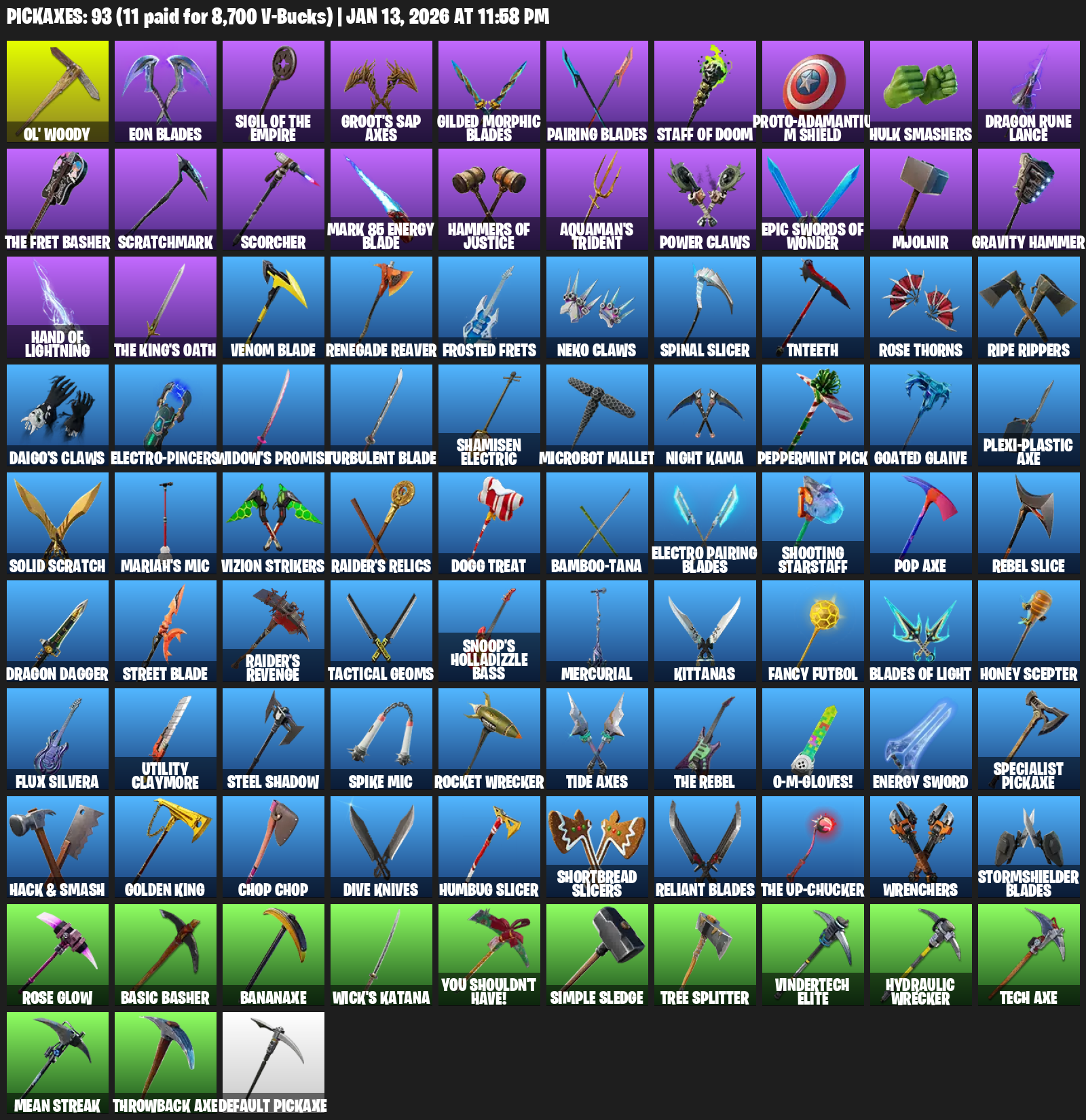 Raider’s Revenge, Ol’ Woody, Eon Blades, Sigil of the Empire, Groot’s Sap Axes, Proto-Adamantium Shield, Hulk Smashers, Dragon Rune Lance, Scratchmark, Scorcher, Mark 85 Energy Blade, Aquaman’s Trident, Power Claws, Mjolnir