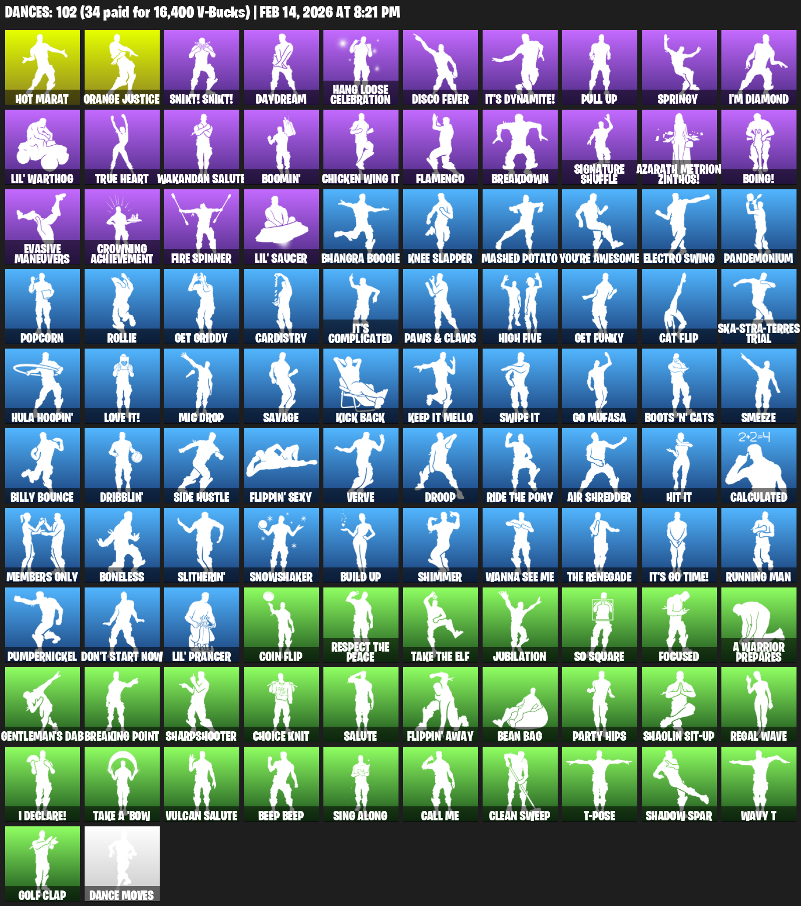 Hot Marat, Orange Justice, Snikt! Snikt!, Daydream, Hang Loose Celebration, Disco Fever, It’s Dynamite!, Pull Up, Springy , I’m Diamond, Lil’ Warthog, True Heart, Wakandan Salute, Boomin’, Chicken Wing It, Flamenco, Breakdown, Signature Shuffle, Azarath Metrion Zinthos!, Boing!