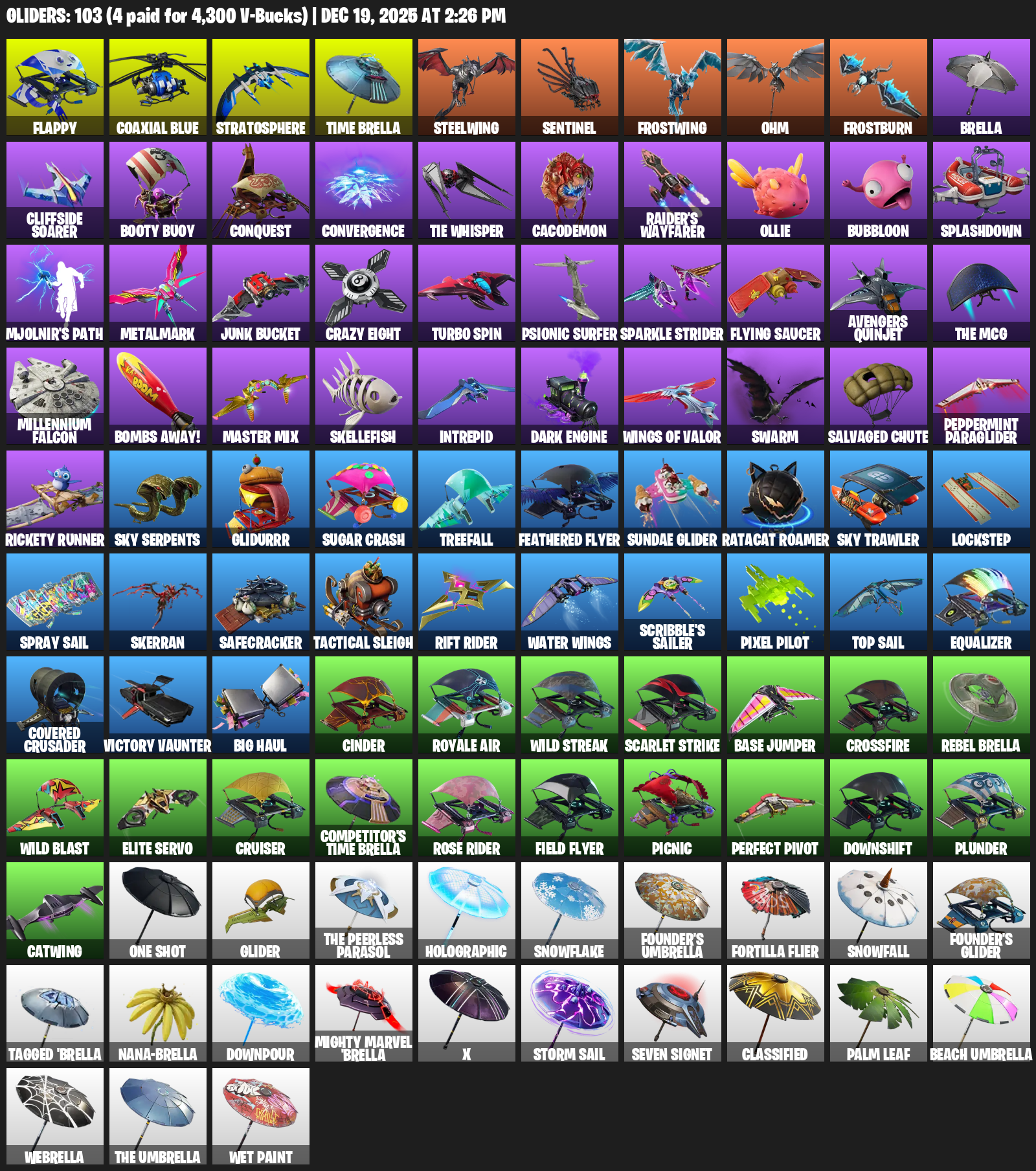 Flappy, Coaxial Blue, Stratosphere, Time Brella, Steelwing, Sentinel, Frostwing, Ohm, Frostburn, Cliffside Soarer, Booty Buoy, Conquest, Convergence, TIE Whisper, Cacodemon, Raider’s Wayfarer, Ollie, Bubbloon, Splashdown
