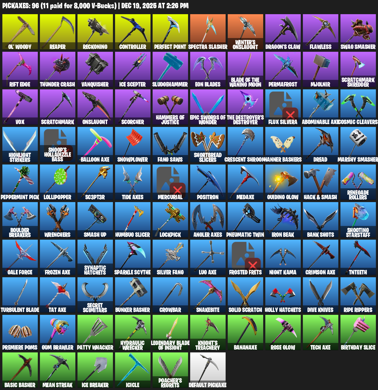 Ol’ Woody, Reaper, Reckoning, Controller, Winter’s Onslaught, Dragon’s Claw, Flawless, Swag Smasher, Rift Edge, Thunder Crash, Vanquisher, Ice Scepter, Sludgehammer, Eon Blades, Permafrost, Mjolnir, Scratchmark Shredder