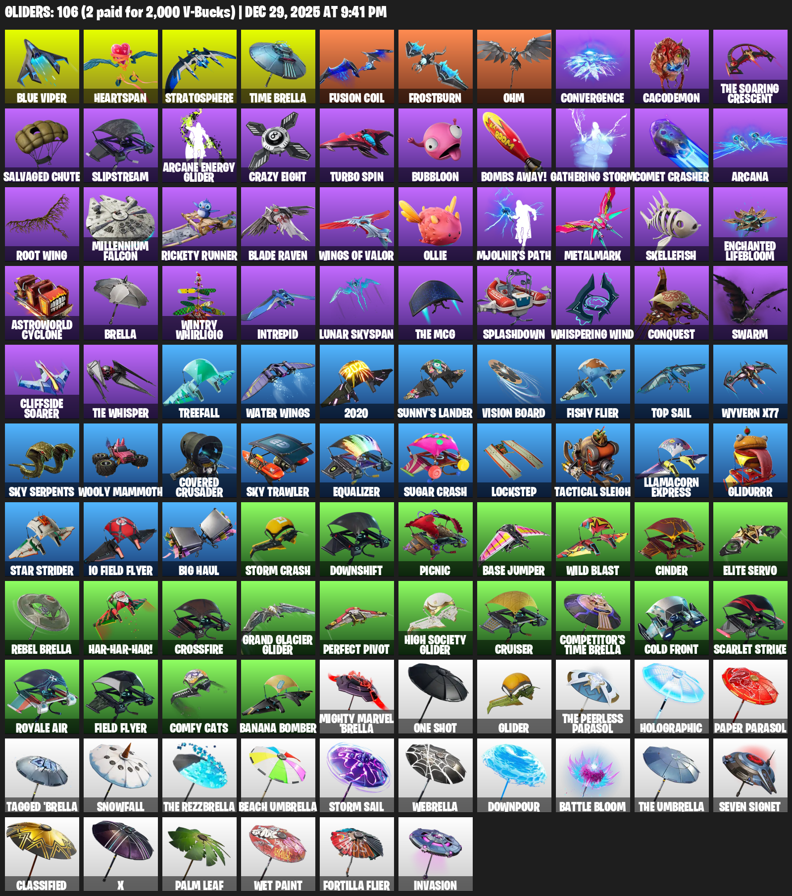 Blue Viper, Heartspan, Stratosphere, Time Brella, Frostburn, Ohm, Convergence, Cacodemon, Salvaged Chute, Slipstream, Arcane Energy Glider, Crazy Eight, Turbo Spin, Bubbloon, Bombs Away!, Gathering Storm, Comet Crasher, Arcana