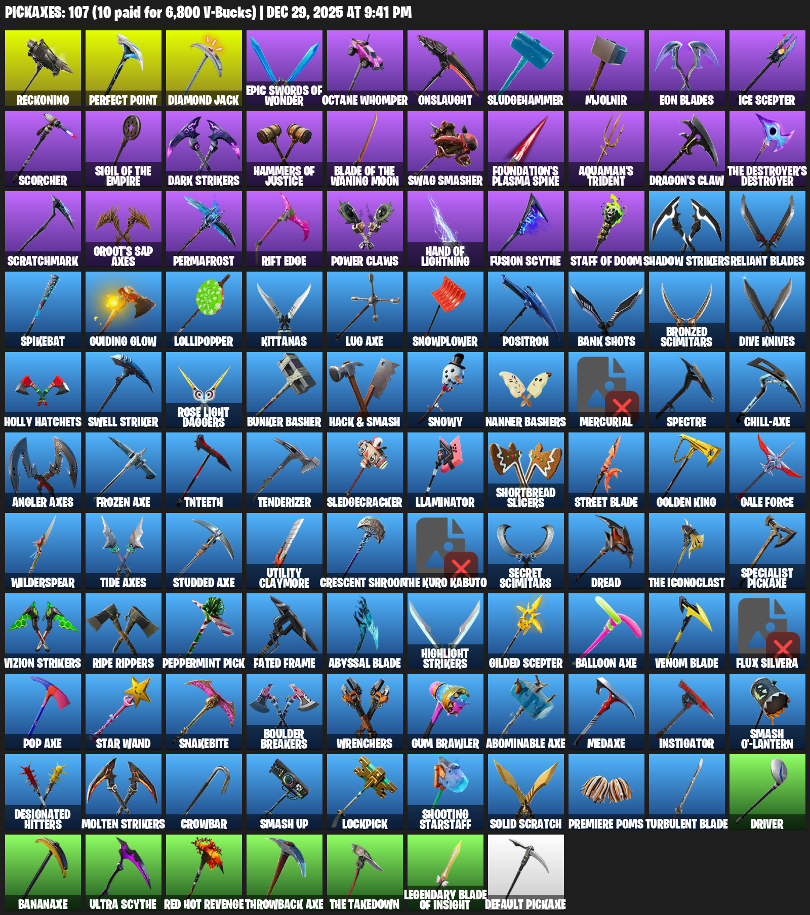 Reckoning, Perfect Point, Octane Whomper, Onslaught, Sludgehammer, Mjolnir, Eon Blades, Ice Scepter, Scorcher, Dark Strikers, Hammers of Justice, Swag Smasher, Foundation’s Plasma Spike, Aquaman’s Trident, Dragon’s Claw