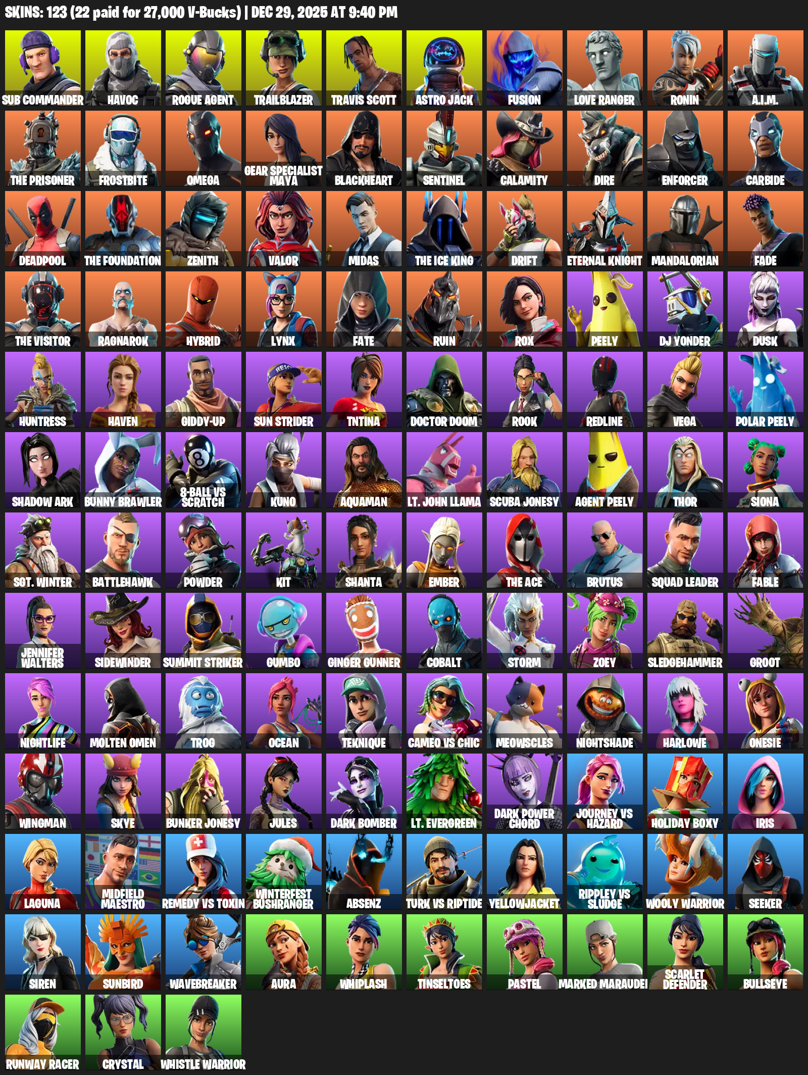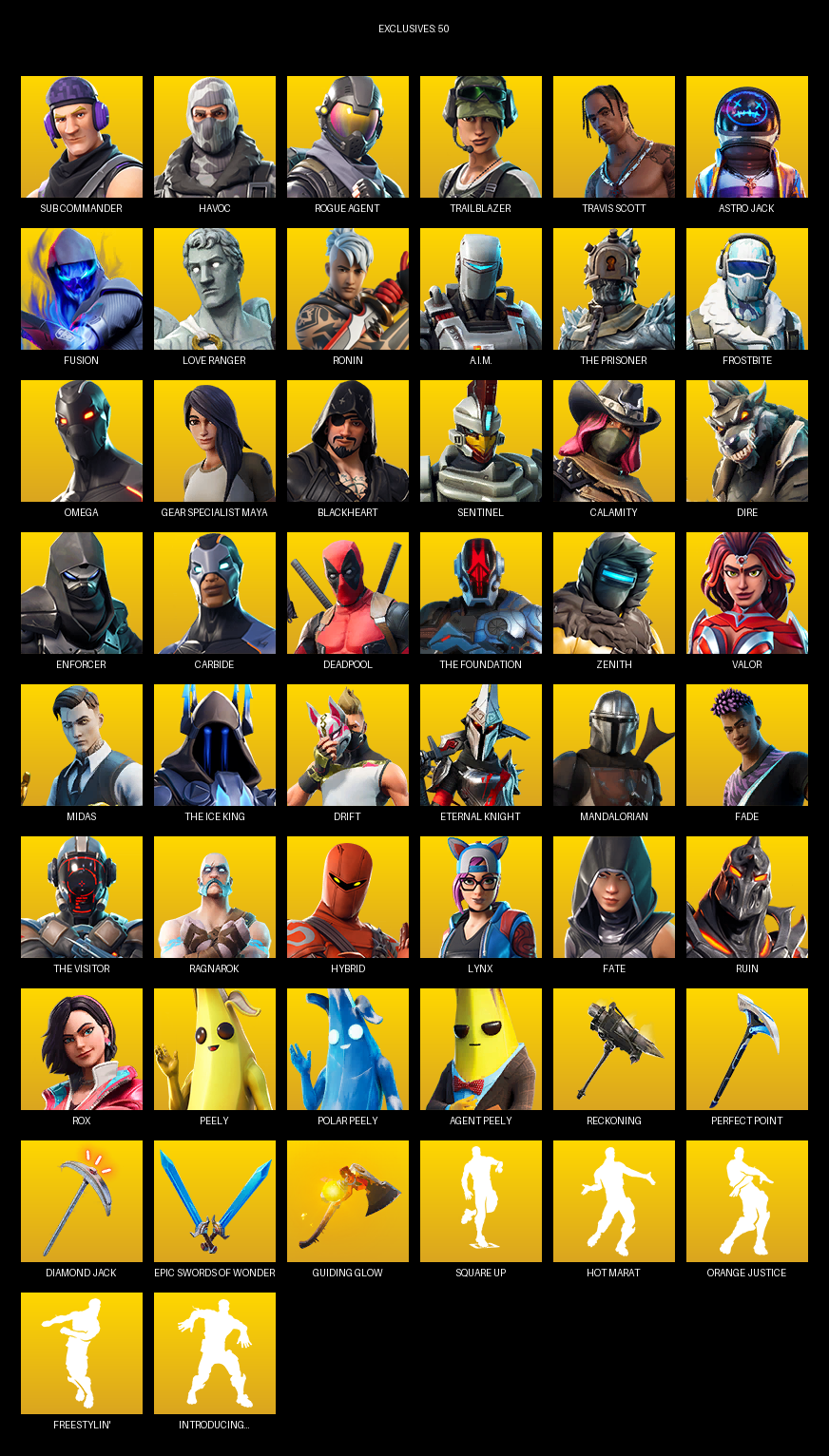 Travis Scott, Omega, Gear Specialist Maya, Sub Commander, Havoc, Rogue Agent, Trailblazer, Astro Jack, Fusion, Love Ranger, Ronin, A.I.M., The Prisoner, Frostbite, Blackheart, Sentinel, Calamity, Dire, Enforcer, Carbide