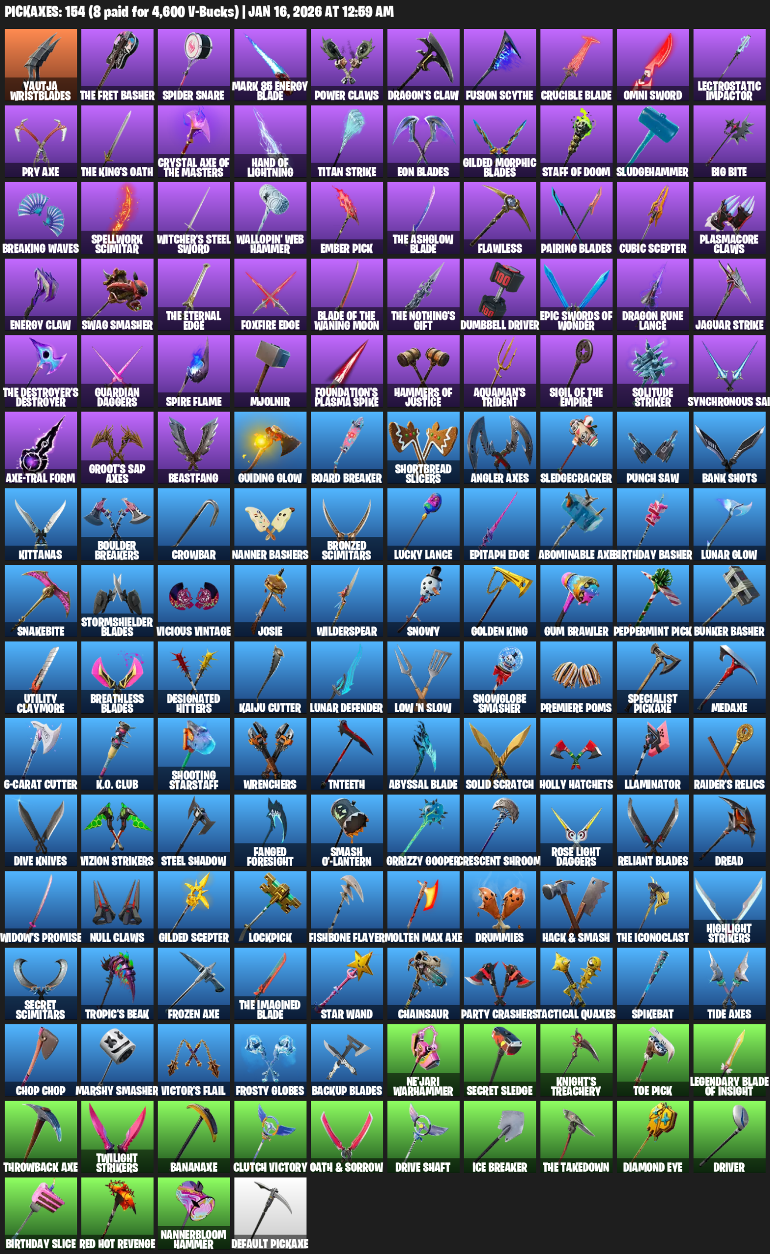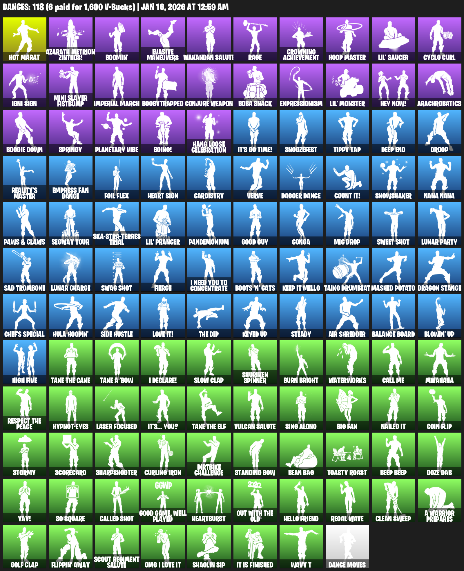 Hot Marat, Azarath Metrion Zinthos!, Boomin’, Evasive Maneuvers, Wakandan Salute, Rage, Crowning Achievement, Hoop Master, Lil’ Saucer, Cyclo Curl, Igni Sign, Mini Slayer Fistbump, Imperial March, Boobytrapped, Conjure Weapon, Boba Snack, Expressionism, Hey Now!, Arachrobatics