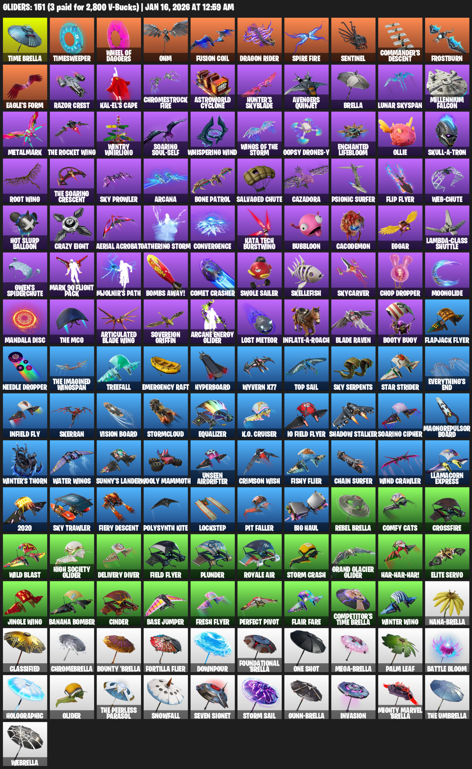 Time Brella, Timesweeper, Ohm, Dragon Rider, Sentinel, Commander’s Descent, Frostburn, Eagle’s Form, Razor Crest, Kal-El’s Cape, Chromestruck Fire, Astroworld Cyclone, Hunter’s Skyblade, Avengers Quinjet, Lunar Skyspan, Millennium Falcon