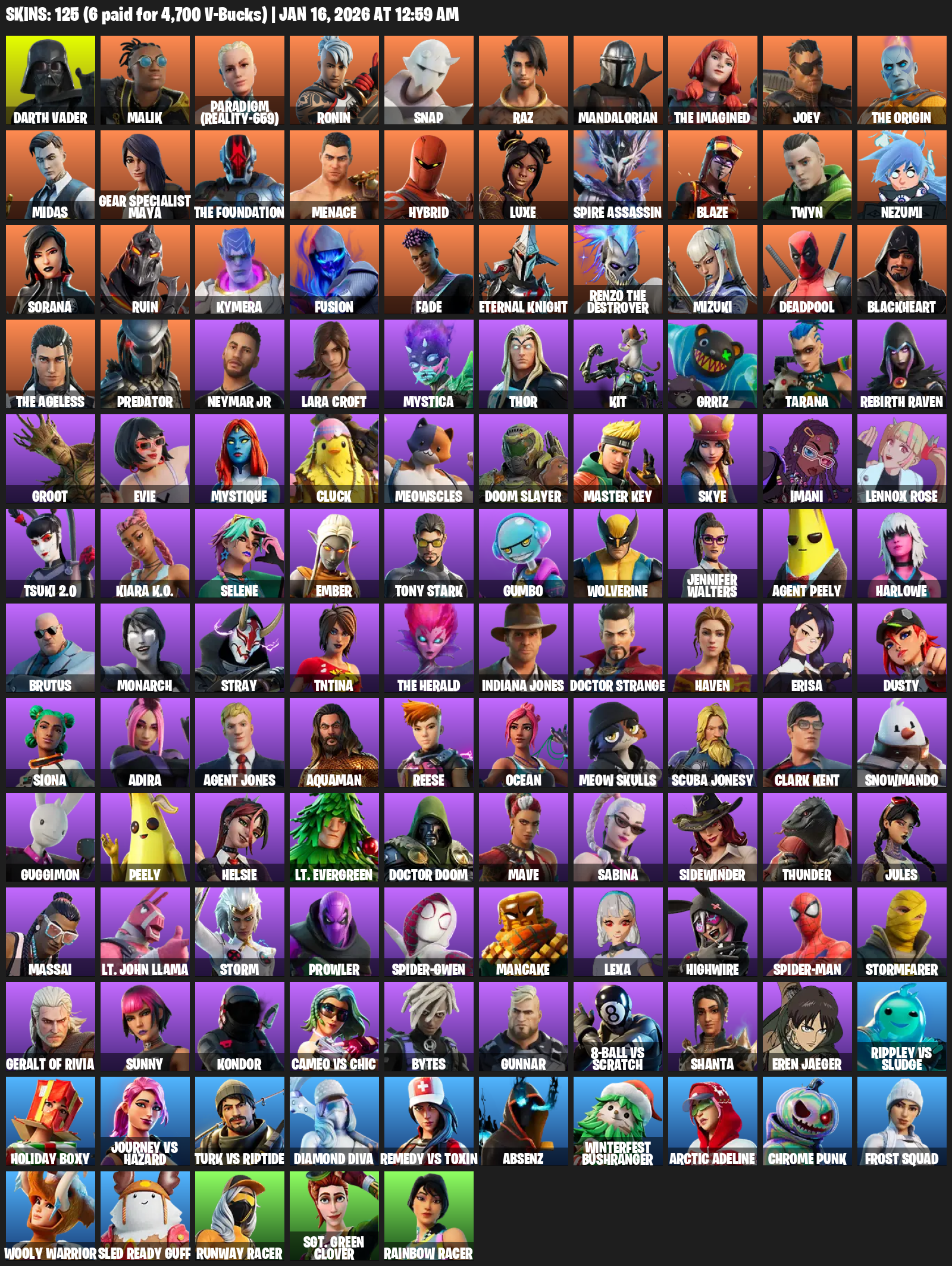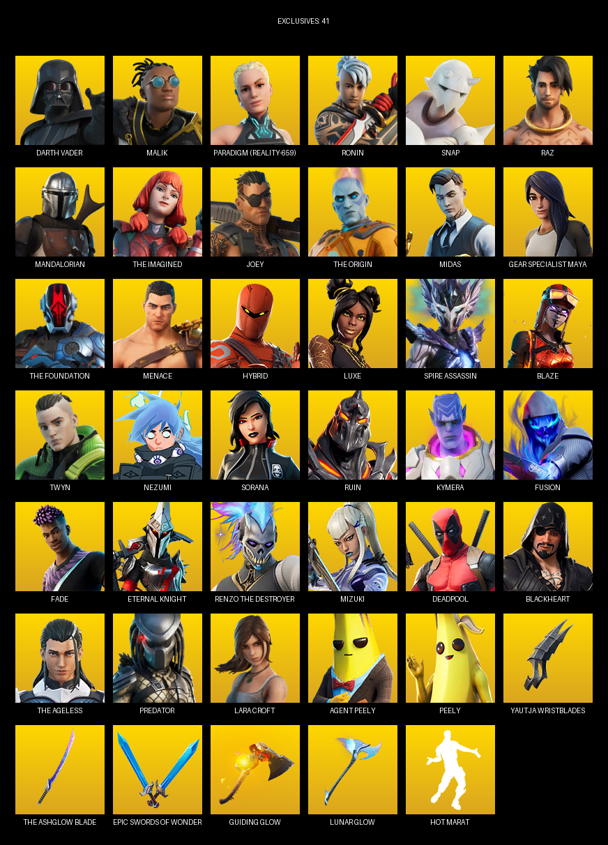 Gear Specialist Maya, Lara Croft, Darth Vader, Malik, Paradigm (Reality-659), Ronin, Snap, Raz, Mandalorian, The Imagined, Joey, Midas, Menace, Hybrid, Luxe, Spire Assassin, Blaze, Twyn