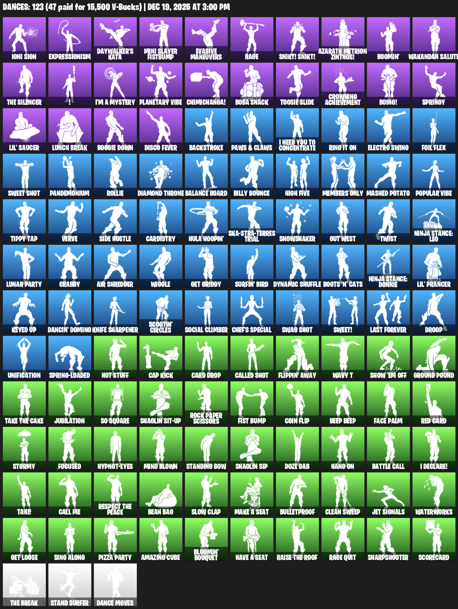Igni Sign, Expressionism, Daywalker’s Kata, Mini Slayer Fistbump, Evasive Maneuvers, Rage, Snikt! Snikt!, Azarath Metrion Zinthos!, Boomin’, Wakandan Salute, !, I’m a Mystery, Planetary Vibe, Chimichanga!, Boba Snack, Toosie Slide, Crowning Achievement, Boing!, Springy