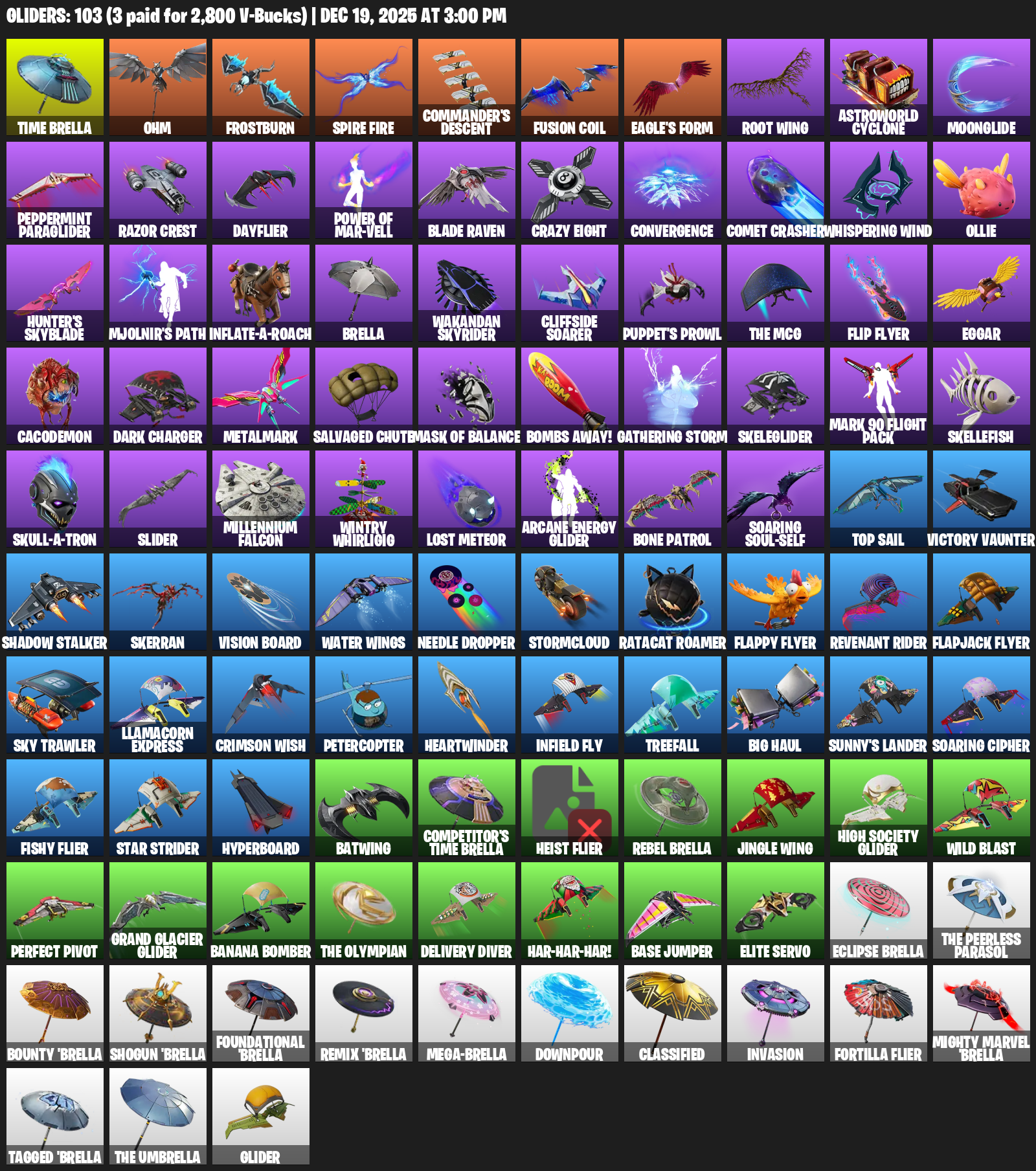 Time Brella, Ohm, Frostburn, Spire Fire, Commander’s Descent, Eagle’s Form, Root Wing, Astroworld Cyclone, Moonglide, Peppermint Paraglider, Razor Crest, Dayflier, Crazy Eight, Convergence, Comet Crasher, Whispering Wind, Ollie
