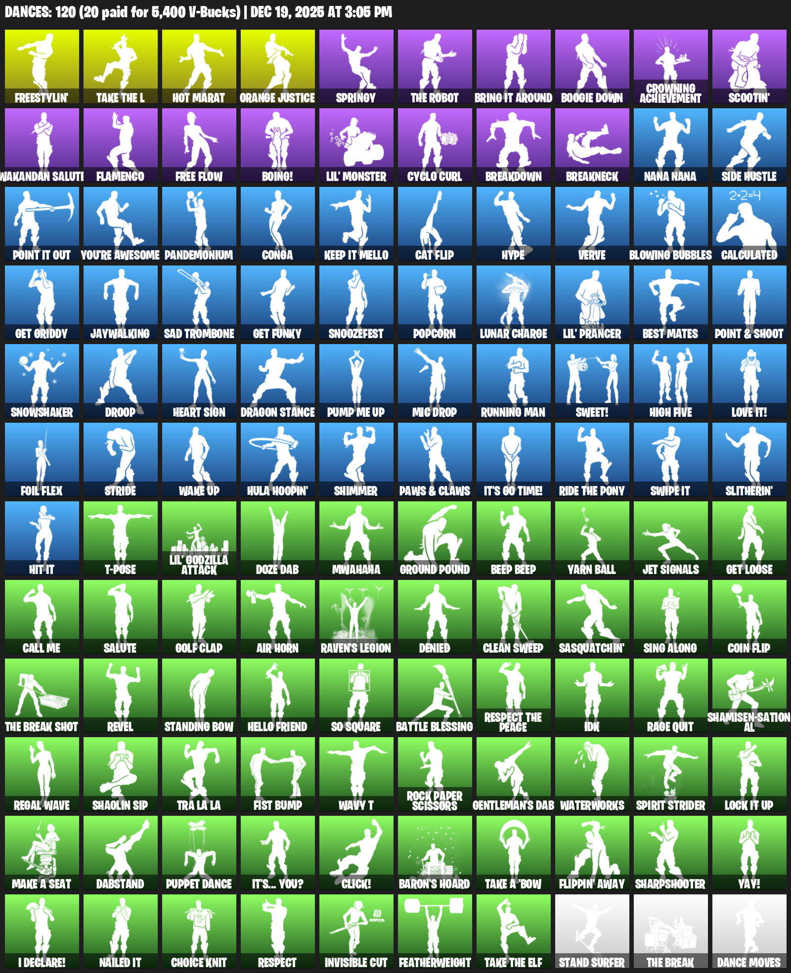 Hot Marat, Freestylin’, Orange Justice, Springy, Bring it around, Boogie Down, Crowning Achievement, Scootin’, Wakandan Salute, Flamenco, Free Flow, Boing!, Lil’ Monster, Cyclo Curl, Breakdown, Breakneck, Nana Nana, Side Hustle