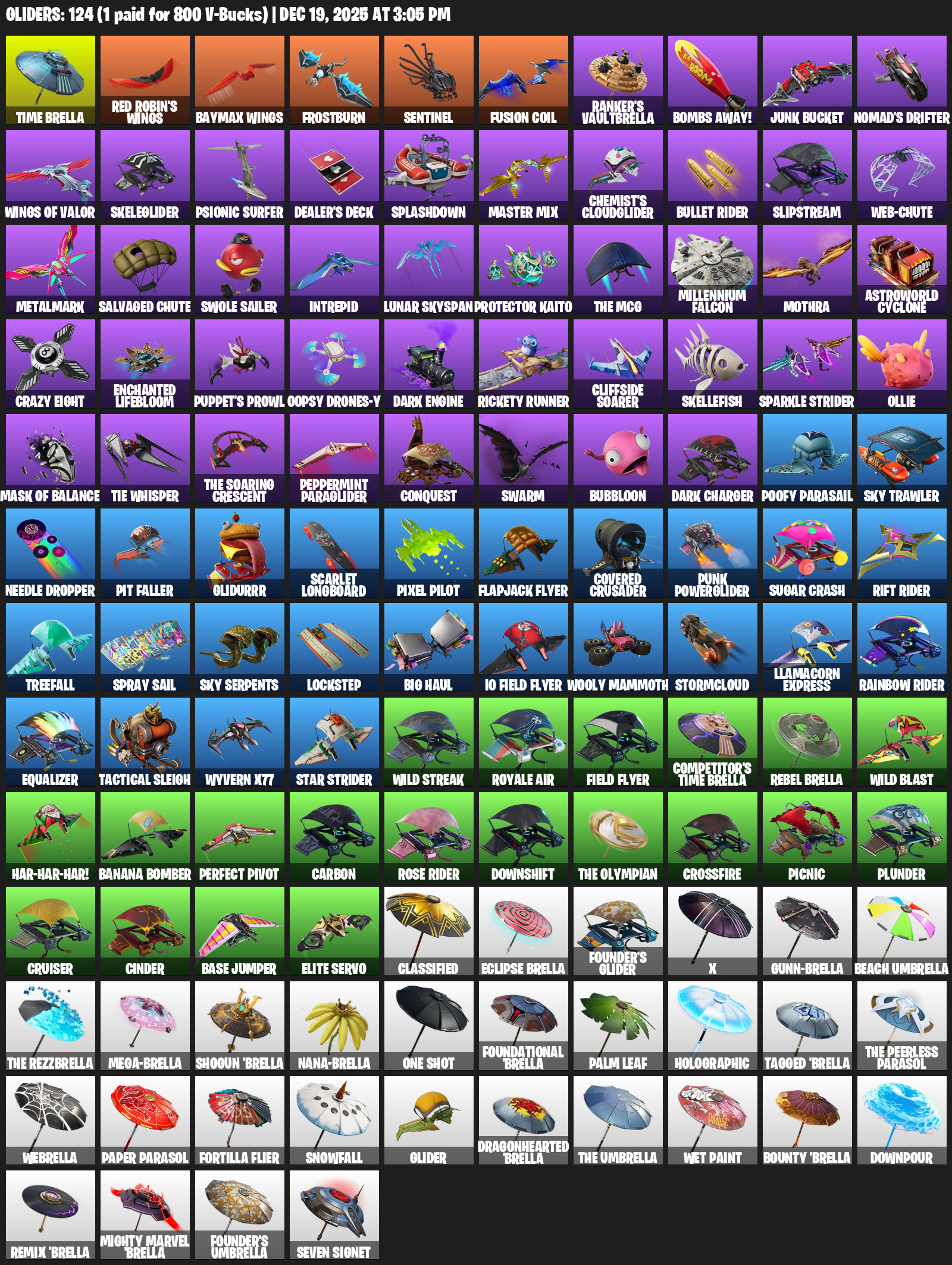 Time Brella, Red Robin’s Wings, Frostburn, Sentinel, Ranker’s Vaultbrella, Bombs Away!, Junk Bucket, Nomad’s Drifter, Skeleglider, Psionic Surfer, Dealer’s Deck, Splashdown, Master Mix, Chemist’s Cloudglider, Bullet Rider, Slipstream