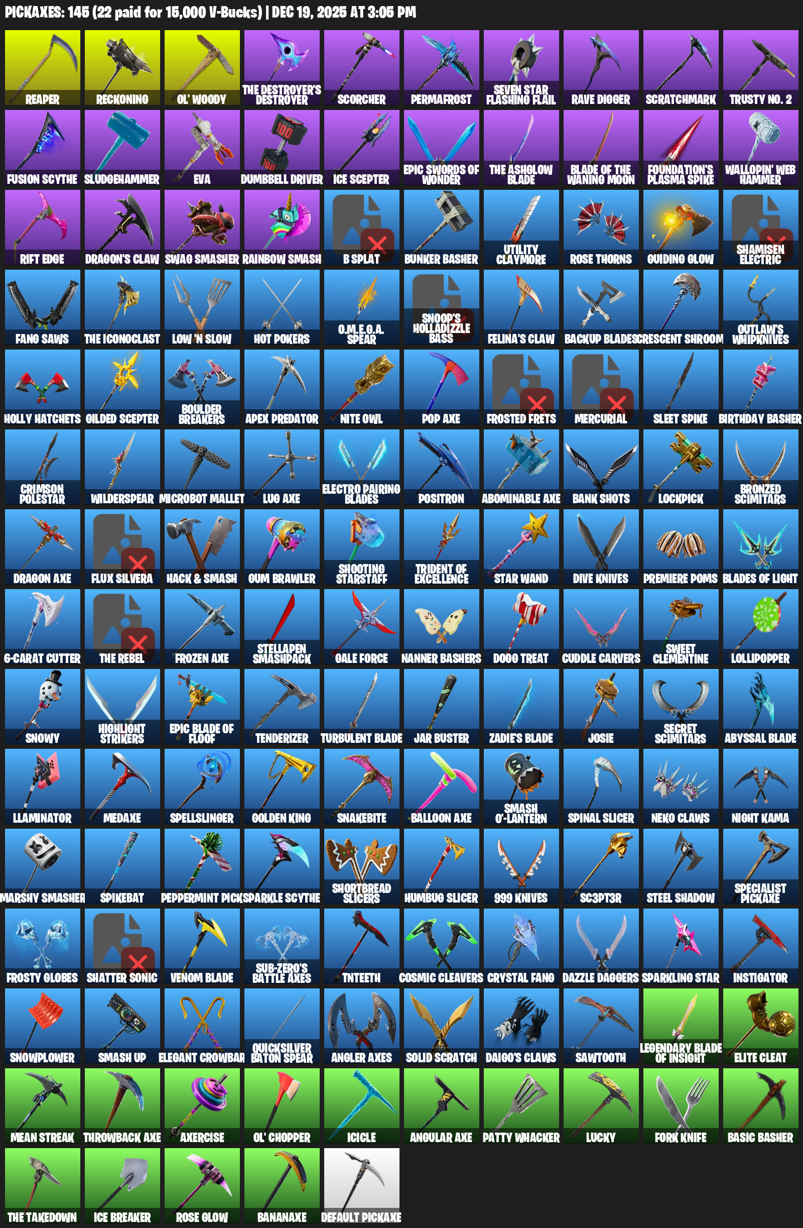 Reckoning, Ol’ Woody, Scorcher, Permafrost, Seven Star Flashing Flail, Rave Digger, Scratchmark, Trusty No. 2, Sludgehammer, EVA, Dumbbell Driver, Ice Scepter, Foundation’s Plasma Spike, Wallopin’ Web Hammer