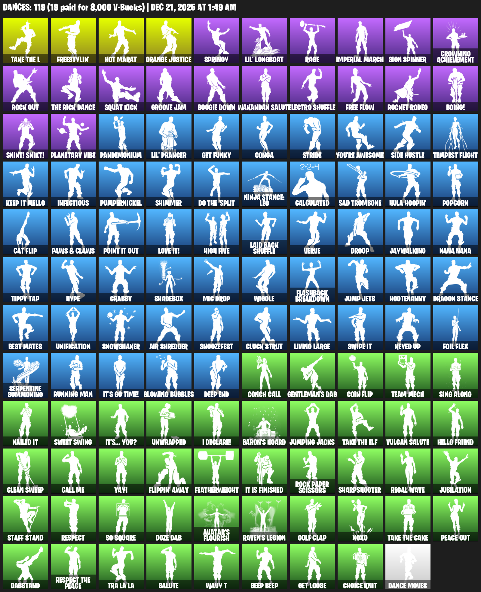 Hot Marat, Freestylin’, Orange Justice, Springy, Lil’ Longboat, Rage, Imperial March, Sign Spinner, Crowning Achievement, Rock Out, Squat Kick, Groove Jam, Boogie Down, Wakandan Salute, Electro Shuffle, Free Flow, Rocket Rodeo, Boing!