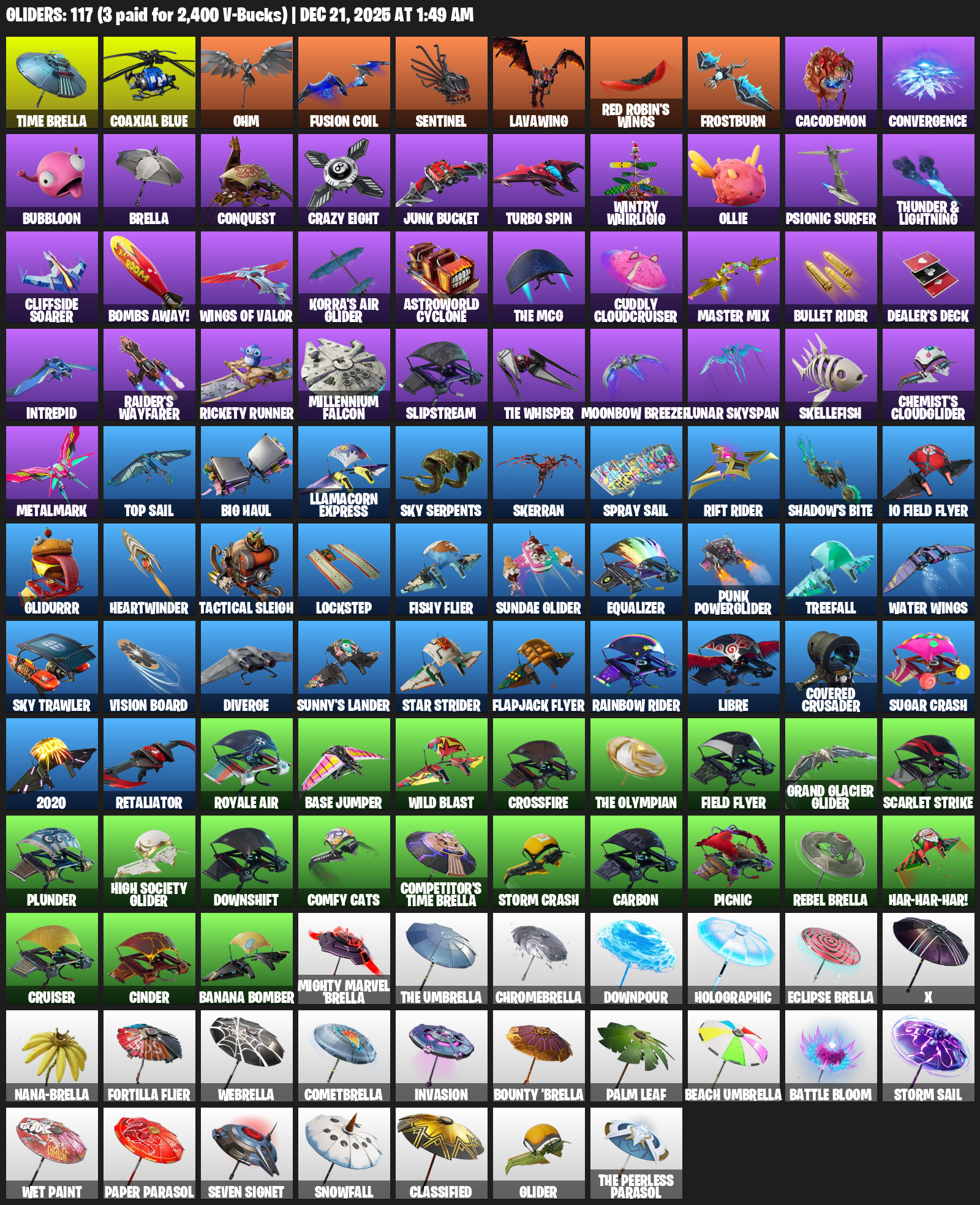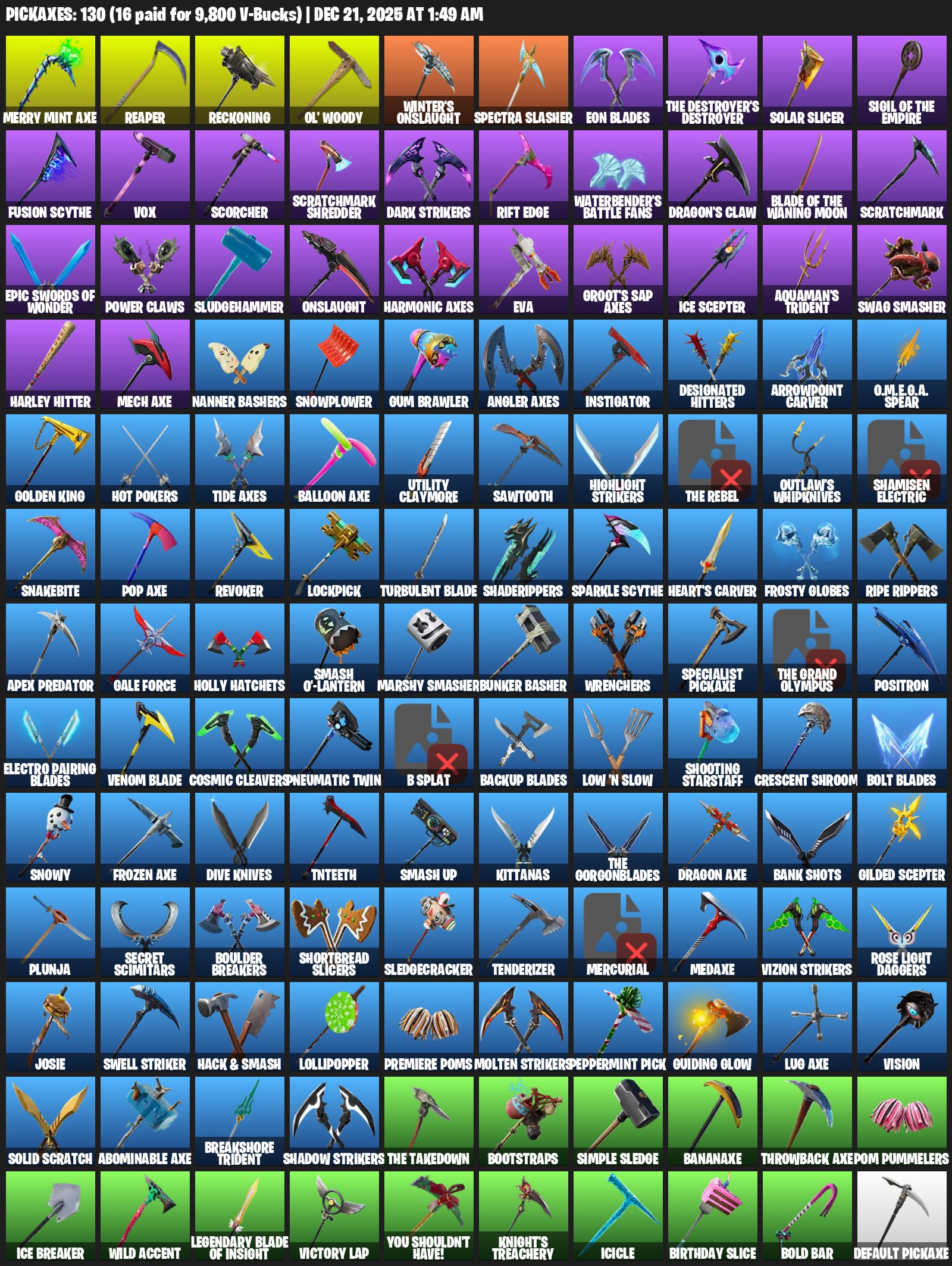 Merry Mint Axe, Reaper, Reckoning, Ol’ Woody, Winter’s Onslaught, Eon Blades, The Destroyer’s Destroyer, Solar Slicer, Fusion Scythe, Vox, Scorcher, Scratchmark Shredder, Rift Edge, Waterbender’s Battle Fans, Dragon’s Claw