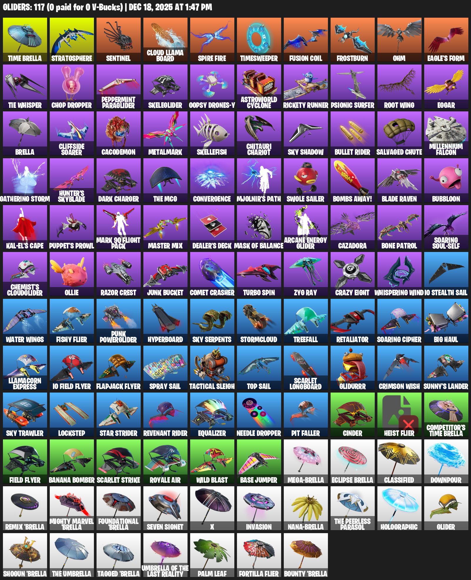 Time Brella, Stratosphere, Sentinel, Cloud Llama Board, Timesweeper, Fusion Coil, Frostburn, Ohm, Eagle’s Form, TIE Whisper, Chop Dropper, Peppermint Paraglider, Skeleglider, Oopsy Drones-y, Astroworld Cyclone, Rickety Runner, Psionic Surfer, Root Wing, Eggar