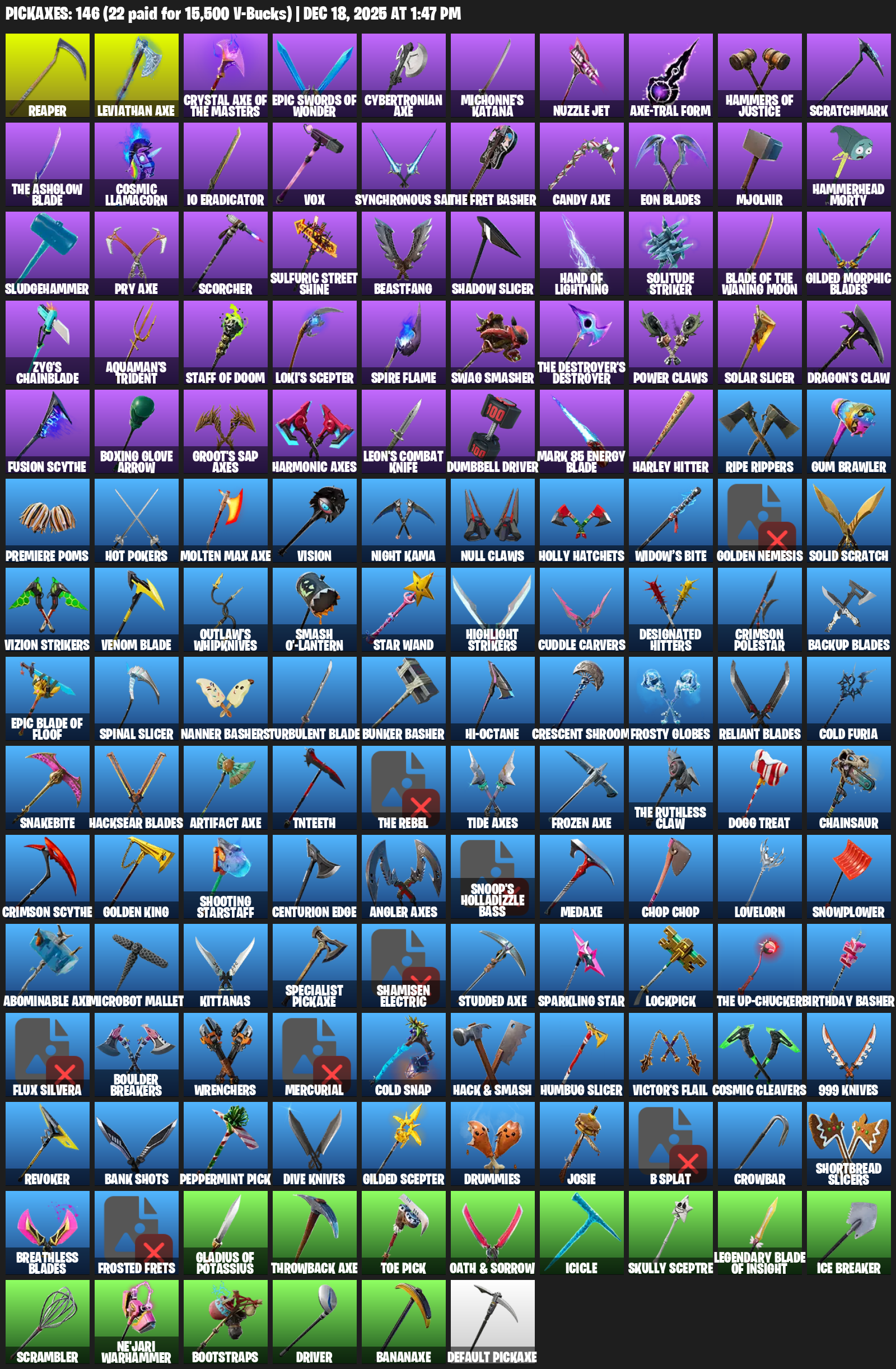 Leviathan Axe, Reaper, Michonne’s Katana, Nuzzle Jet, Hammers of Justice, Scratchmark, The Ashglow Blade, Cosmic Llamacorn, IO Eradicator, Vox, Synchronous Sai, Eon Blades, Mjolnir, Hammerhead Morty