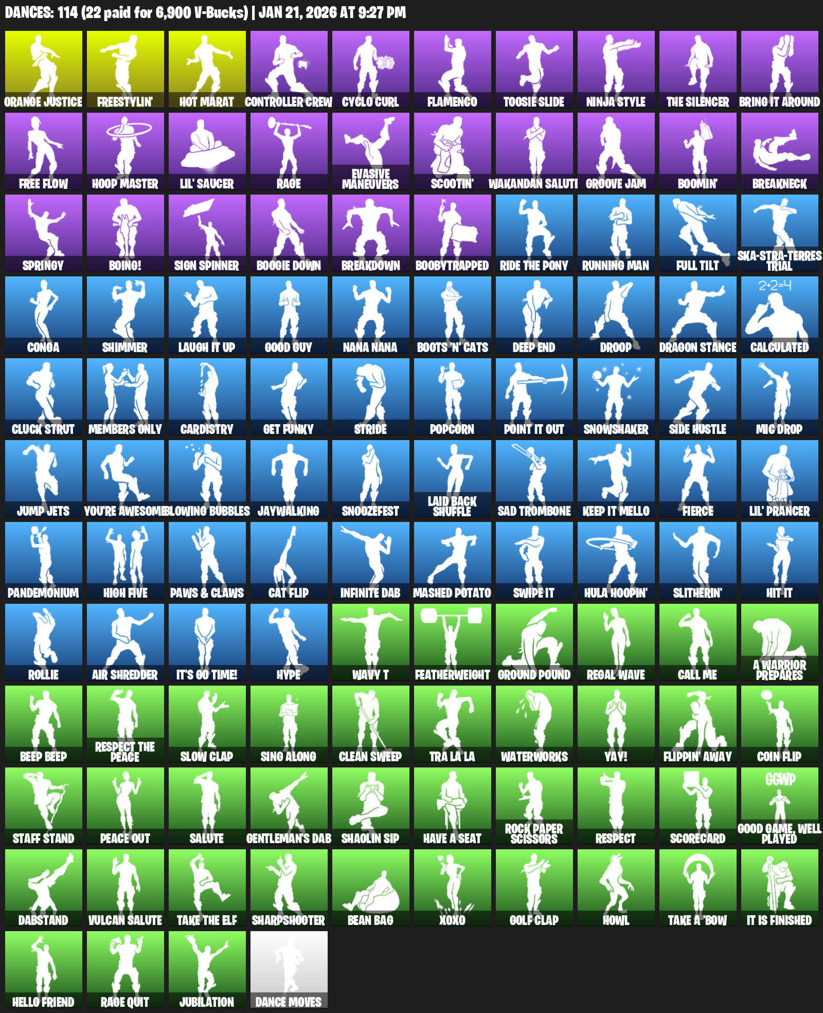 Hot Marat, Freestylin’, Cyclo Curl, Flamenco, Toosie Slide, Ninja Style, Bring it around, Free Flow, Hoop Master, Lil’ Saucer, Rage, Evasive Maneuvers, Scootin’, Wakandan Salute, Groove Jam, Boomin’, Breakneck