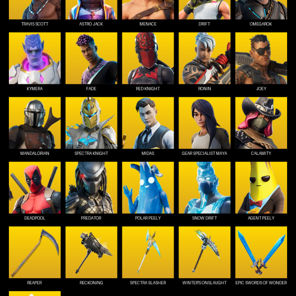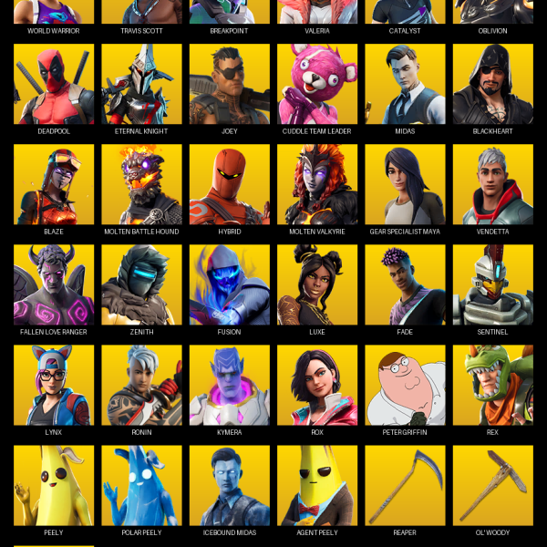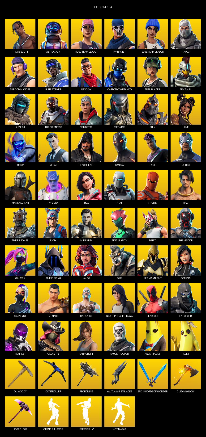 Travis Scott, Omega, Gear Specialist Maya, Lara Croft, Astro Jack, Rose Team Leader, Warpaint, Havoc, Sub Commander, Blue Striker, Prodigy, Carbon Commando, Trailblazer, Sentinel, Zenith, The Scientist, Vendetta, Predator, Ruin