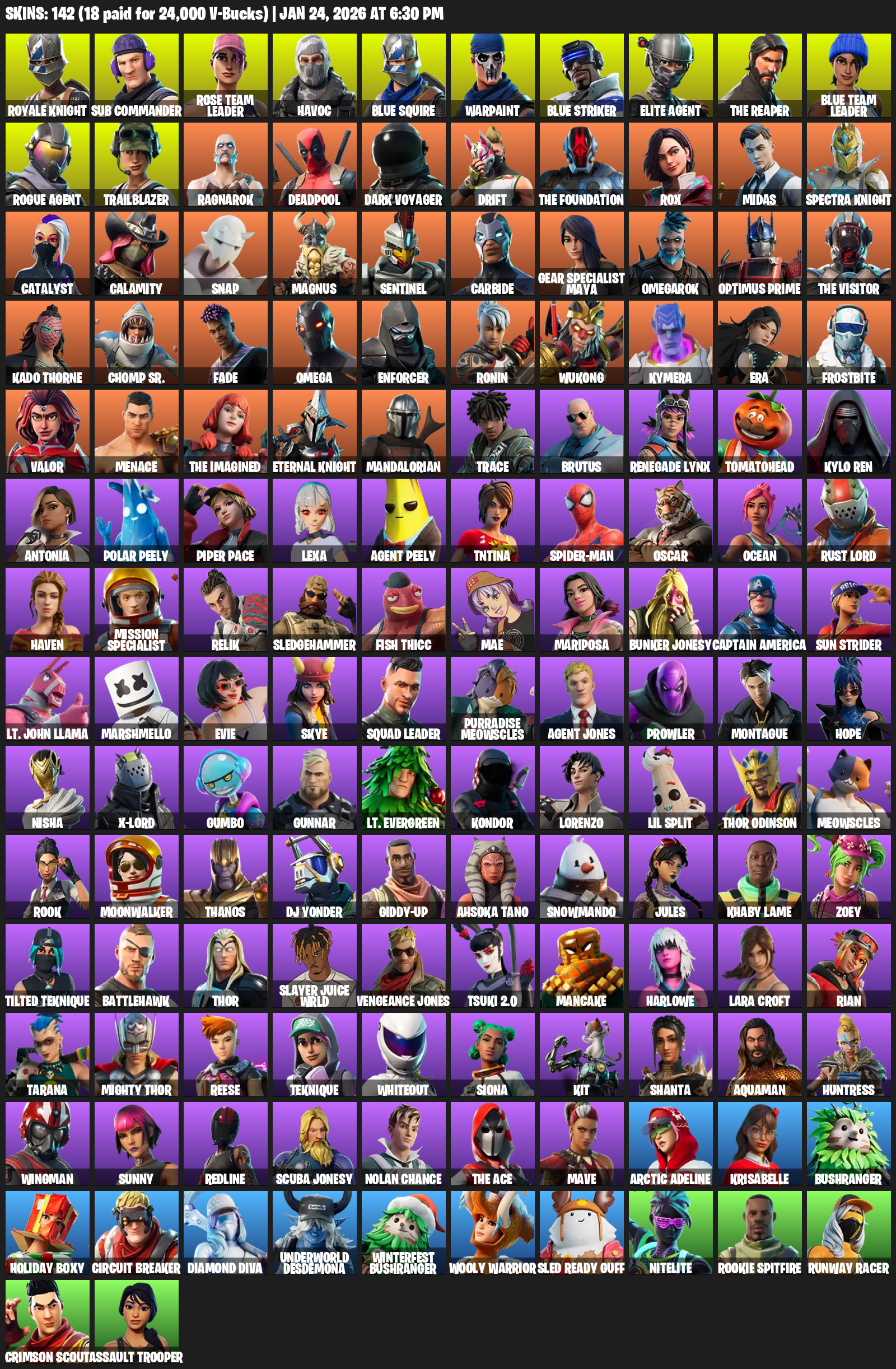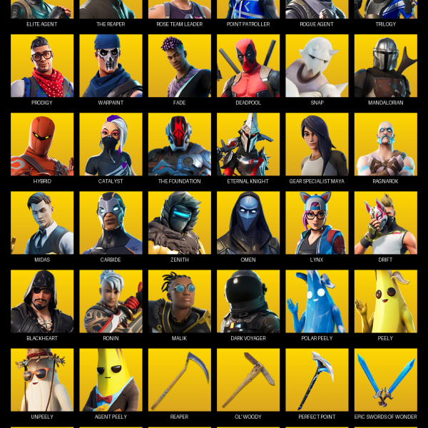 Royale Knight, Blue Squire, Elite Agent, The Reaper, Gear Specialist Maya, Omega, Lara Croft, Sub Commander, Rose Team Leader, Havoc, Warpaint, Trailblazer, Ragnarok, Deadpool, Dark Voyager, Drift