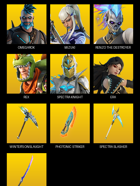 Omega, Gear Specialist Maya, John Wick, Rogue Agent, Blue Striker, Fate, Wild Card, Spider Knight, Deadpool, Backlash, Valor, Oblivion, Ragnarok, Mandalorian, Raptor, Catalyst, Zenith, The Ice King, Raven, Hybrid