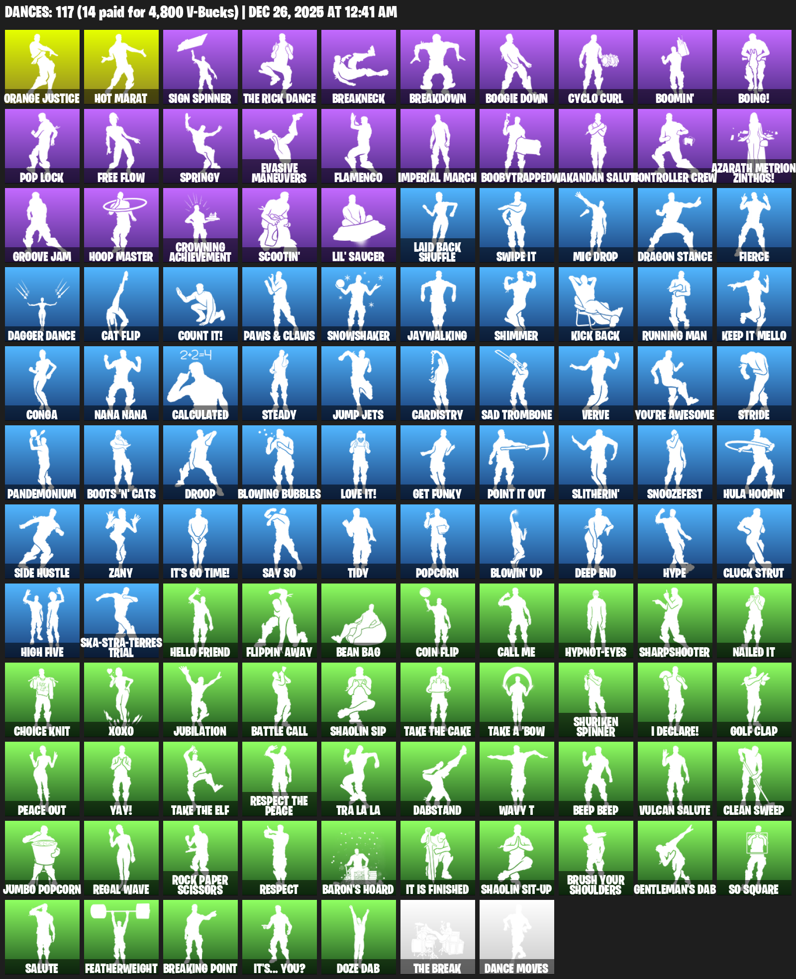Hot Marat, Sign Spinner, Breakneck, Breakdown, Boogie Down, Cyclo Curl, Boomin’, Boing!, Pop Lock, Free Flow, Springy, Evasive Maneuvers, Flamenco, Imperial March, Boobytrapped, Wakandan Salute, Controller Crew, Azarath Metrion Zinthos!