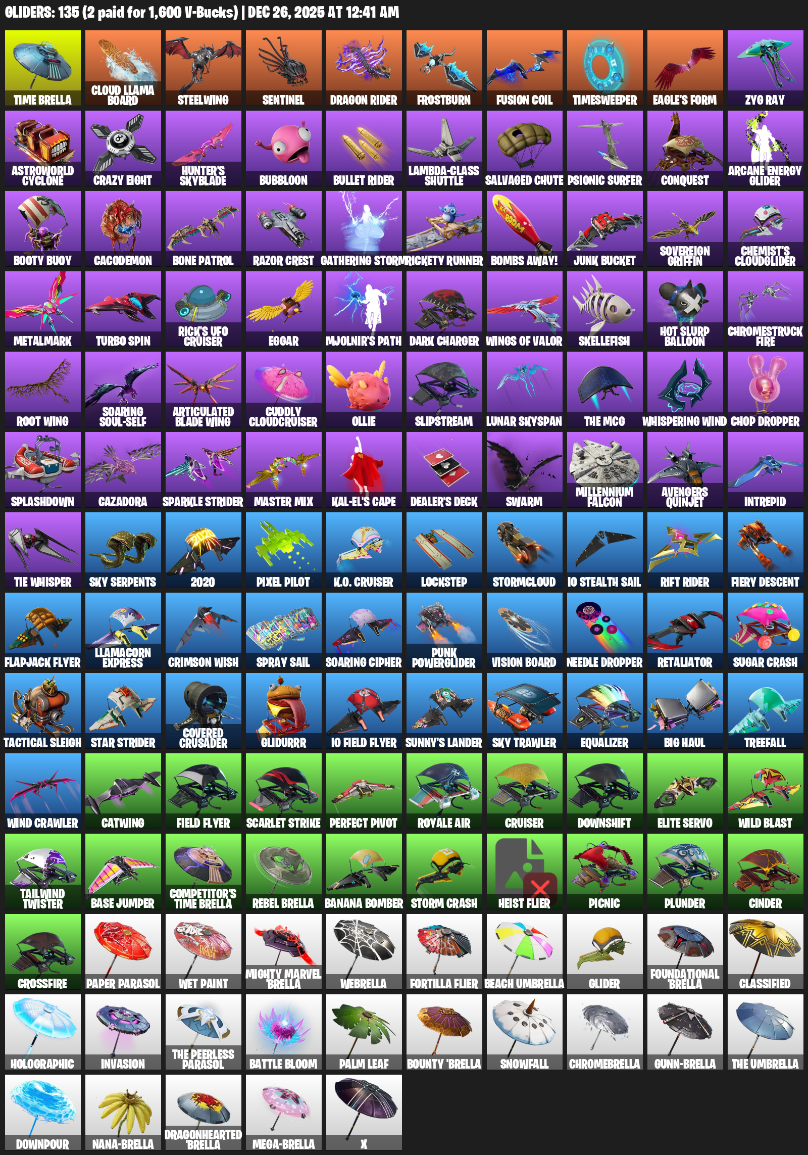 Time Brella, Cloud Llama Board, Steelwing, Sentinel, Dragon Rider, Frostburn, Timesweeper, Zyg Ray, Astroworld Cyclone, Crazy Eight, Hunter’s Skyblade, Bubbloon, Lambda-Class Shuttle, Salvaged Chute, Psionic Surfer, Conquest, Arcane Energy Glider