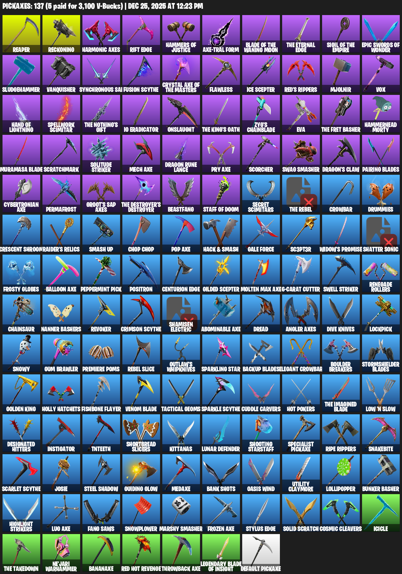 Reaper, Reckoning, Harmonic Axes, Rift Edge, Hammers of Justice, Axe-tral Form, Sludgehammer, Vanquisher, Synchronous Sai, Fusion Scythe, Flawless, Ice Scepter, Red’s Rippers, Mjolnir, Vox