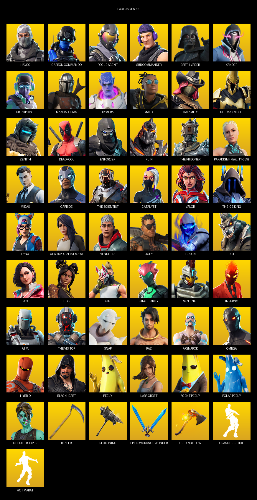 Gear Specialist Maya, Omega, Lara Croft, Havoc, Carbon Commando, Rogue Agent, Sub Commander, Darth Vader, Xander, Breakpoint, Mandalorian, Kymera, Malik, Calamity, Ultima Knight, Zenith, Deadpool, Enforcer, Ruin, The Prisoner