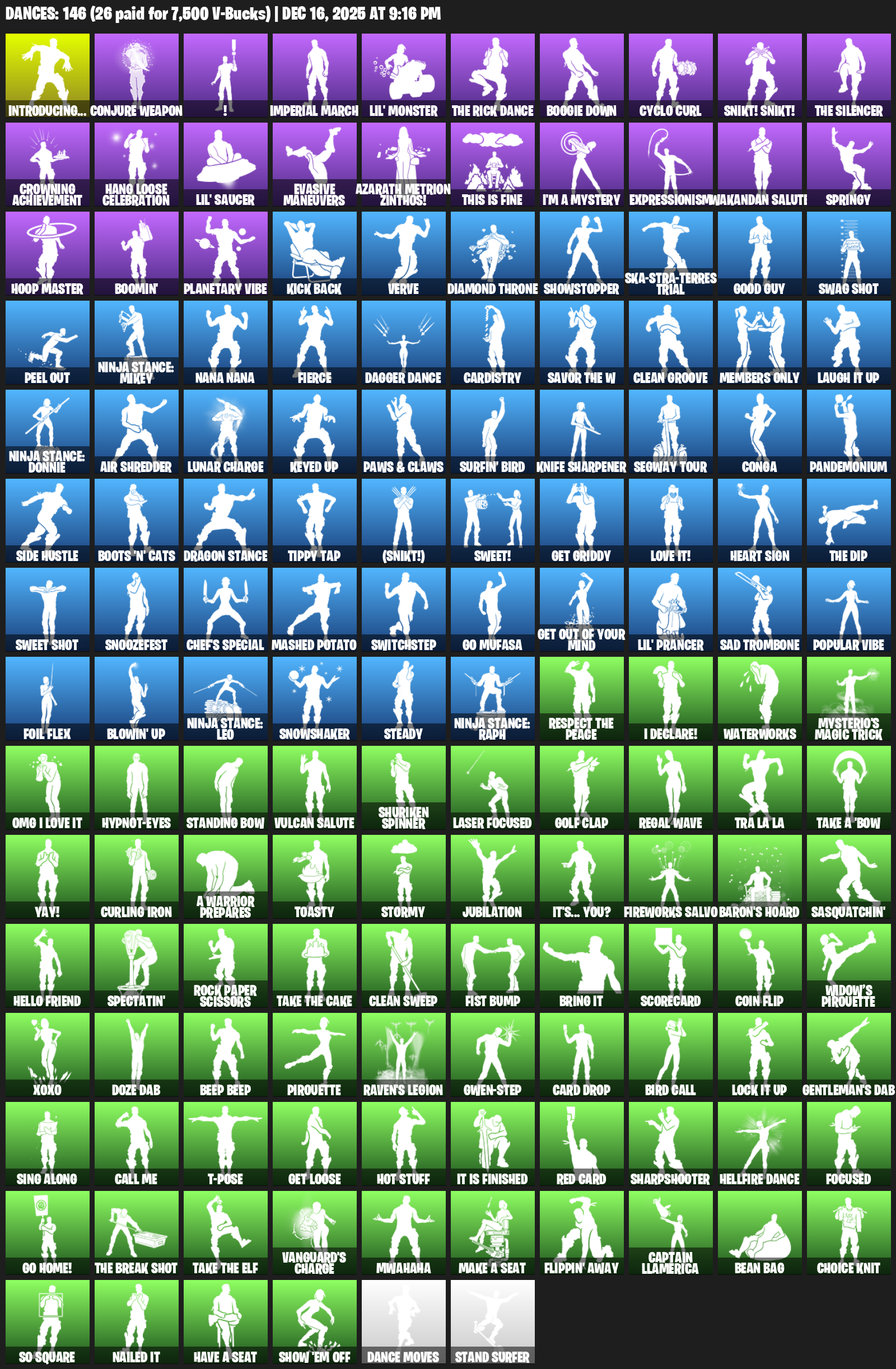 Introducing…, Conjure Weapon, !, Imperial March, Lil’ Monster, Boogie Down, Cyclo Curl, Snikt! Snikt!, Crowning Achievement, Hang Loose Celebration, Evasive Maneuvers, Azarath Metrion Zinthos!, This is Fine, I’m a Mystery, Expressionism, Wakandan Salute, Springy