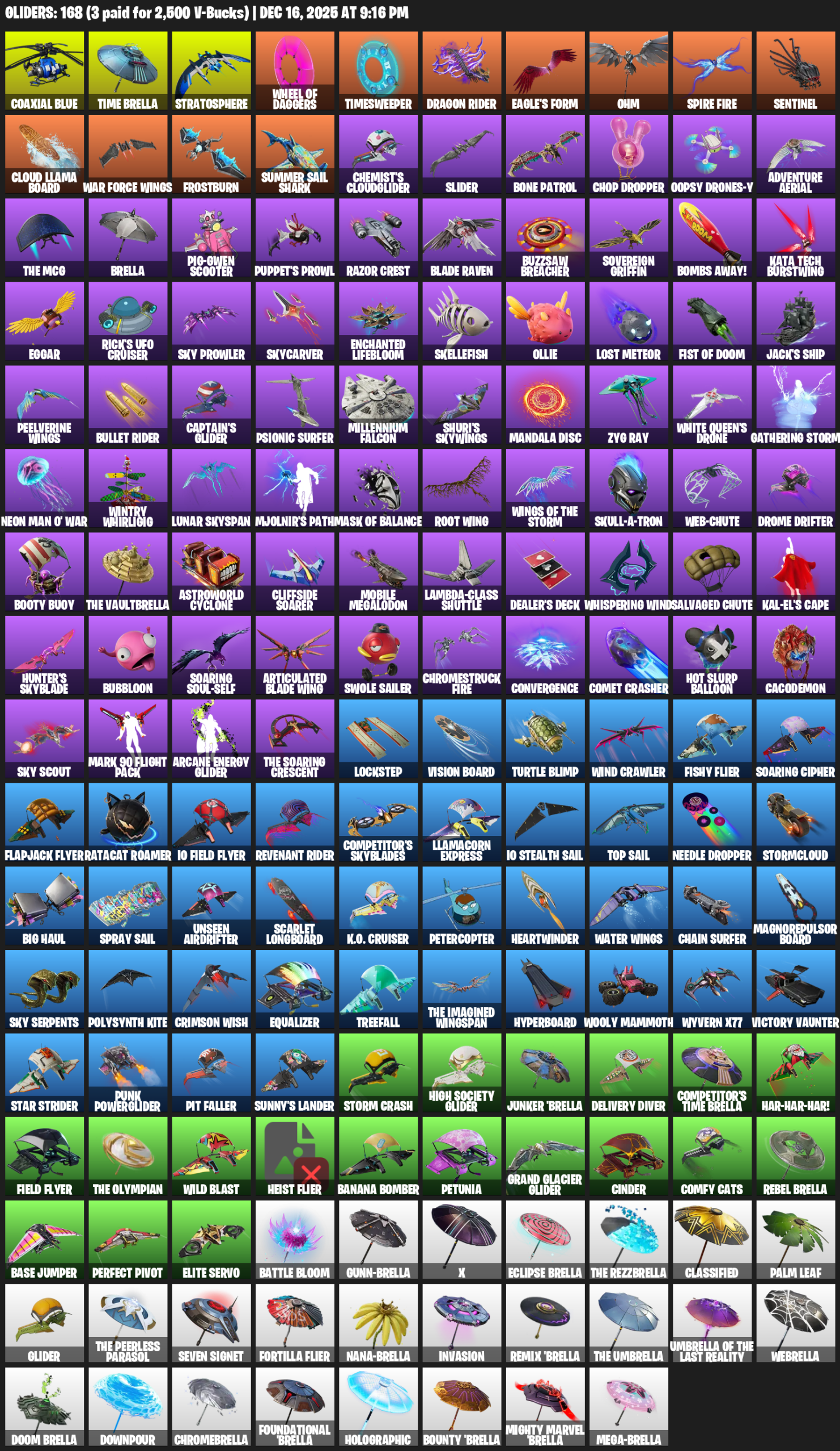 Time Brella, Stratosphere, Wheel of Daggers, Timesweeper, Dragon Rider, Eagle’s Form, Ohm, Sentinel, Cloud Llama Board, War Force Wings, Frostburn, Summer Sail Shark, Chemist’s Cloudglider, Slider, Bone Patrol, Chop Dropper, Oopsy Drones-y, Adventure Aerial