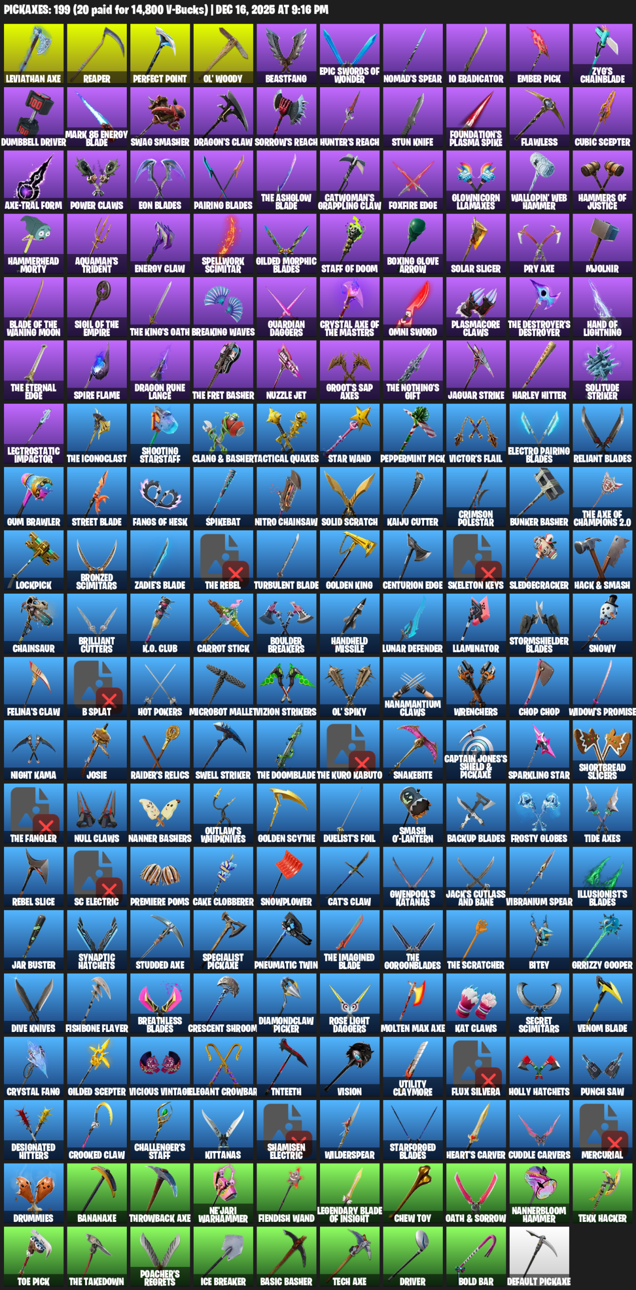 Leviathan Axe, Reaper, Ol’ Woody, Beastfang, Nomad’s Spear, IO Eradicator, Ember Pick, Zyg’s Chainblade, Dumbbell Driver, Mark 85 Energy Blade, Swag Smasher, Dragon’s Claw, Sorrow’s Reach, Stun Knife, Foundation’s Plasma Spike, Flawless, Cubic Scepter