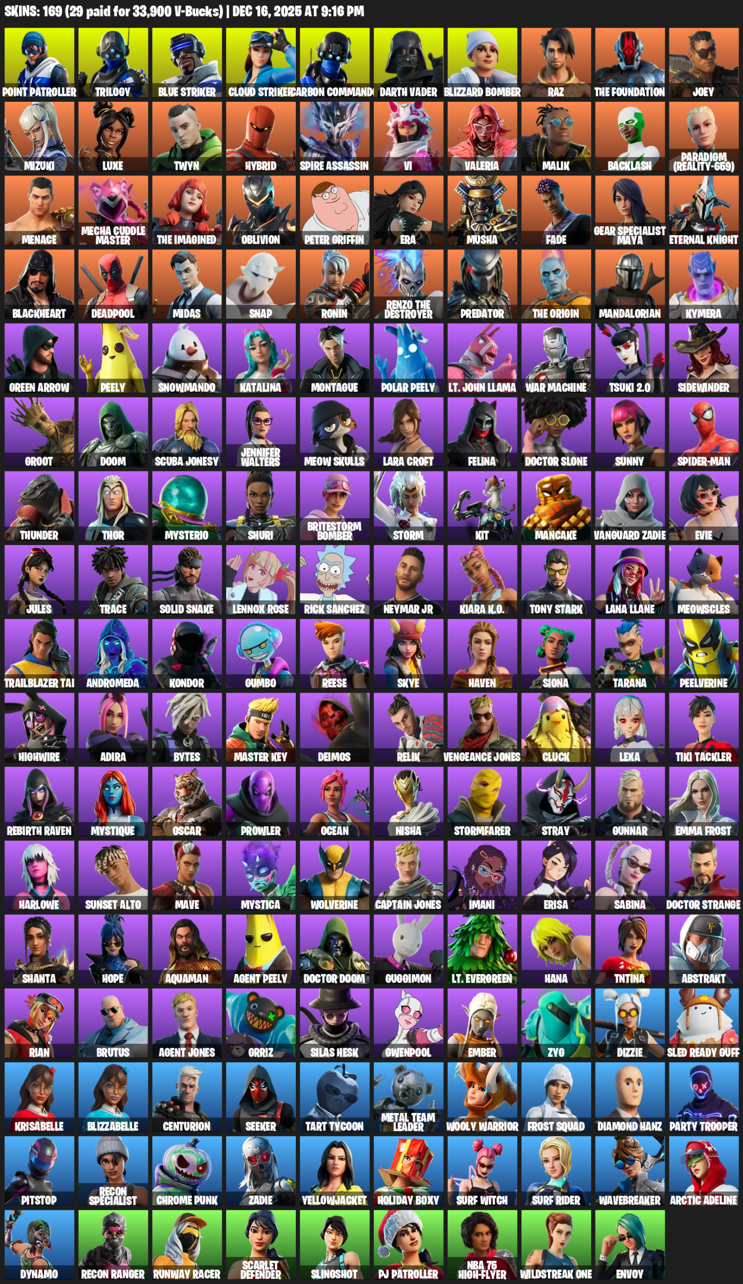 Point Patroller, Gear Specialist Maya, Lara Croft, Trilogy, Blue Striker, Carbon Commando, Darth Vader, Blizzard Bomber, Raz, The Foundation, Joey, Mizuki, Luxe, Twyn, Hybrid, Spire Assassin, Vi, Valeria, Malik