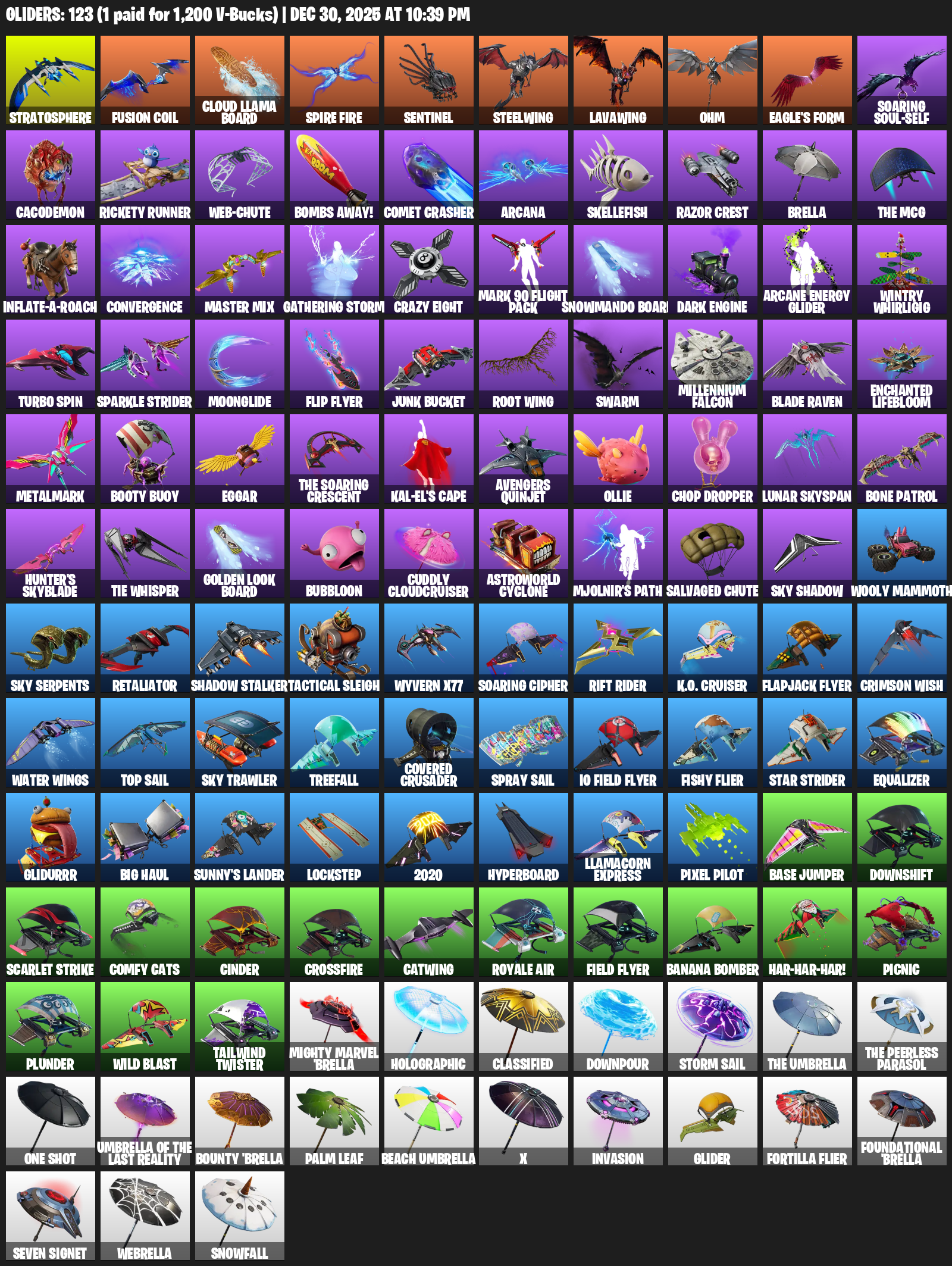 Stratosphere, Cloud Llama Board, Spire Fire, Steelwing, Lavawing, Ohm, Eagle’s Form, Soaring Soul-Self, Cacodemon, Rickety Runner, Web-Chute, Bombs Away!, Comet Crasher, Arcana, Skellefish, Razor Crest, Brella